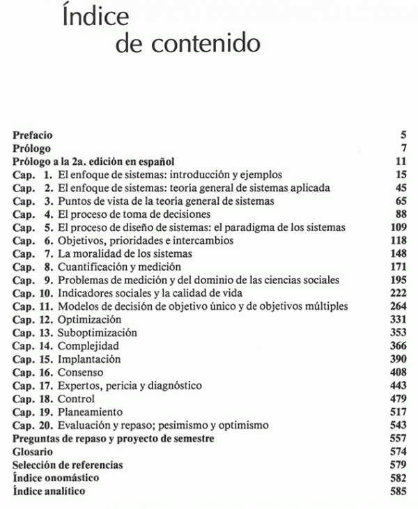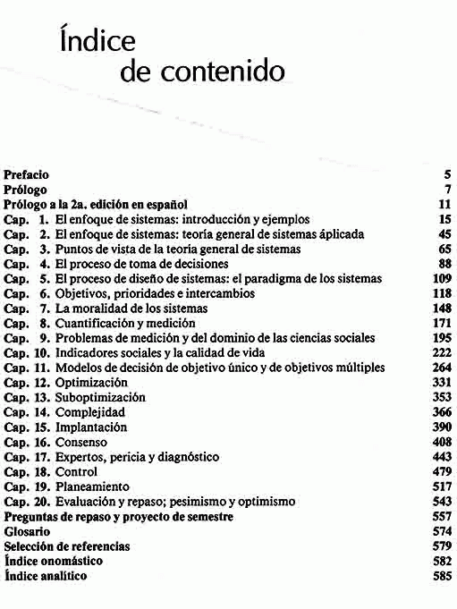 -- Cap. 1. El enfoque de sistemas: introducción y ejemplos. --Cap. 2. El enfoque de sistemas: teórico general de sistemas aplicada. -- Cap. 3. Puntos de vista de la teoría general de sistemas. -- Cap. 4. El proceso de toma de desiciones. -- Cap. 5. El proceso de diseño de sistemas: el paradigma de los sistemas. -- Cap. 6. Objetivos, prioridades e intercambios. -- Cap. 7. La moralidad de los sistemas. -- Cap. 8. Santificación y medición. -- Cap. 9. Problemas de medición y del dominio de las ciencias sociales. -- Cap. 10. Indicadores sociales y la calidad de vida. -- Cap. 11. Modelos de desición de objetos únicos y de objetos múltiples. -- Cap. 12. Optimizan. -- Cap. 13. Suboptimación. -- Cap. 14. Complejidad. -- Cap. 15. Implantación. -- Cap. 16. Consenso. -- Cap. 17. Expertos, Pericia y diagnostico. -- Cap. 18. Control. -- Cap. 19. Planeamiento. -- Cap. 20. Evaluación y repaso; pesimismo y optimismo