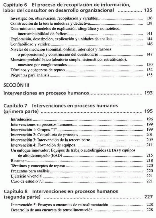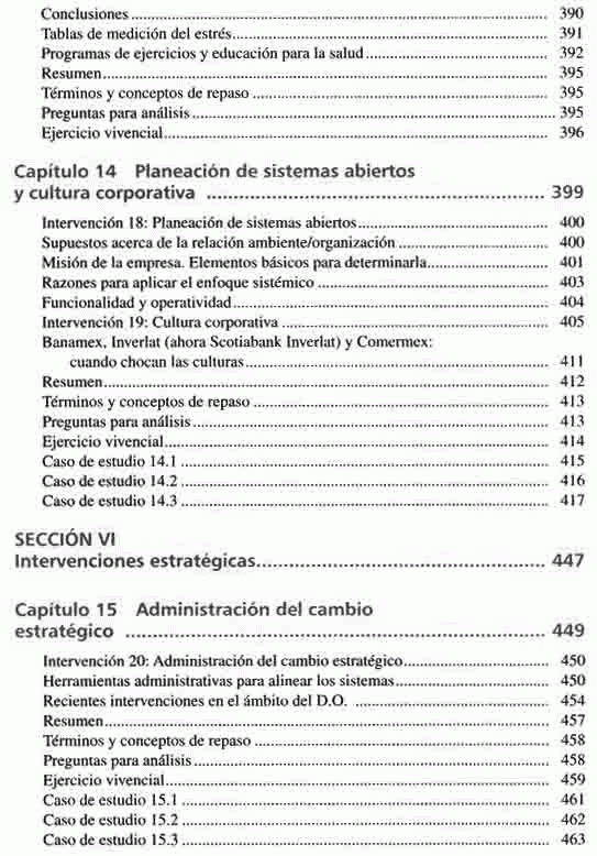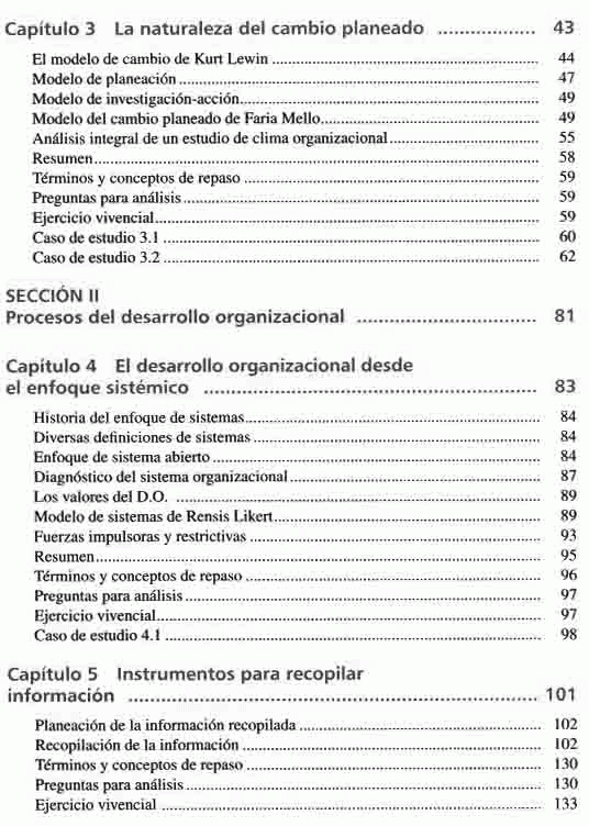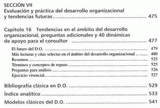 En el libro se analiza: - Los fundamentos del desarrollo organizacional. - La historia del desarrollo organizacional en latinoamericano. - Las principales intervenciones clásicas del cambio a nivel individual, grupal y organizacional. - El novedoso campo de la llamada transformación organizacional (TO).
