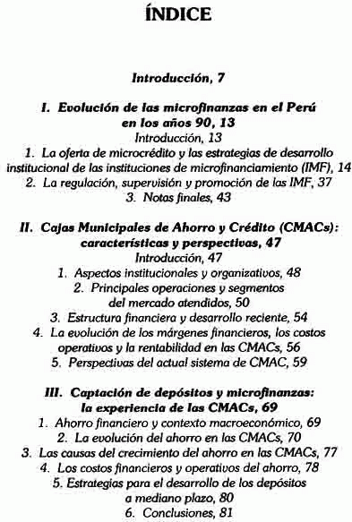 El libro examina el dinámico desarrollo de las micro finanzas en el Perú en los años noventa y los requerimientos de una política de regulación y promoción de estas actividades. De esta forma, se analizan las distinta experiencias en el microcredito de los bancos comerciales y de consumo, de las cajas municipales de ahorro y crédito (CMACs), de las cajas rurales, de las EDPYMES y de MIBANCO. Destacan los logros en cobertura y sostenibilidad de las CMACs. De ahí que se explore mas detalladamente a estos intermediarios en sus características institucionales, experiencias en captación de depósitos y planificación estratégica, así como en un estudio de caso sobre la forma como se enfrentaron las consecuencias del fenómeno del niño en 1998. Las lecciones derivadas de la experiencia de las CMACs pueden ser muy relevantes para el desarrollo de los demás intermediarios interesados en el crédito a la micro empresa y en la ampliación de la frontera del sistema financiero, tarea de gran importancia tomando en cuenta la notable gravitación del sector informal en el Perú.