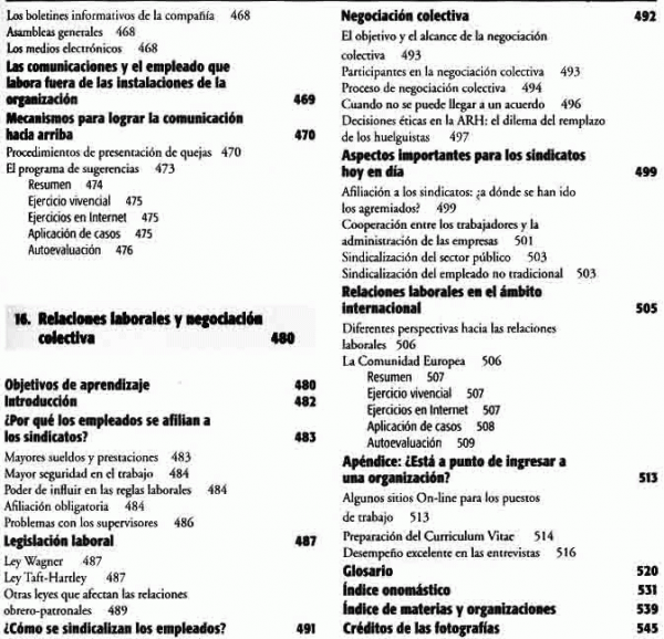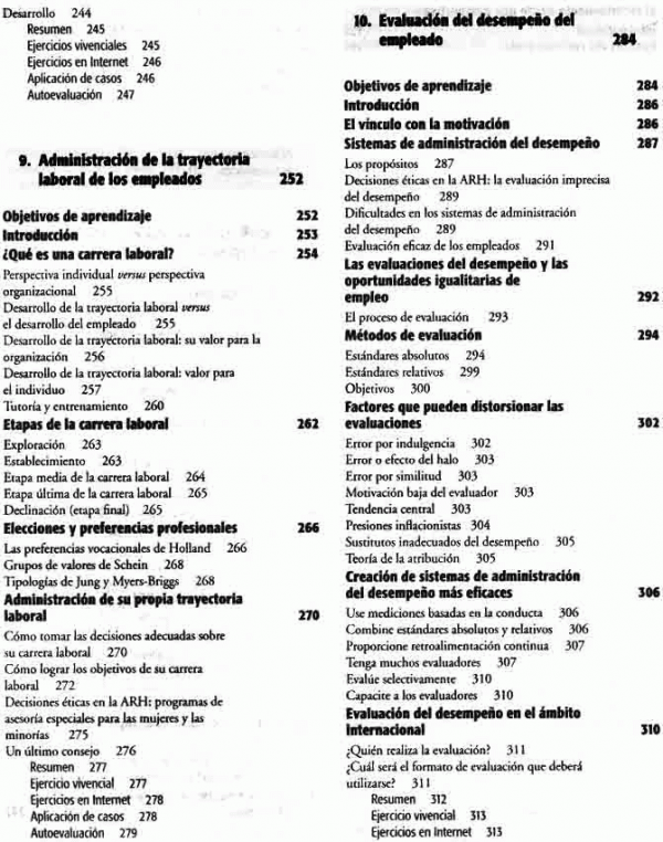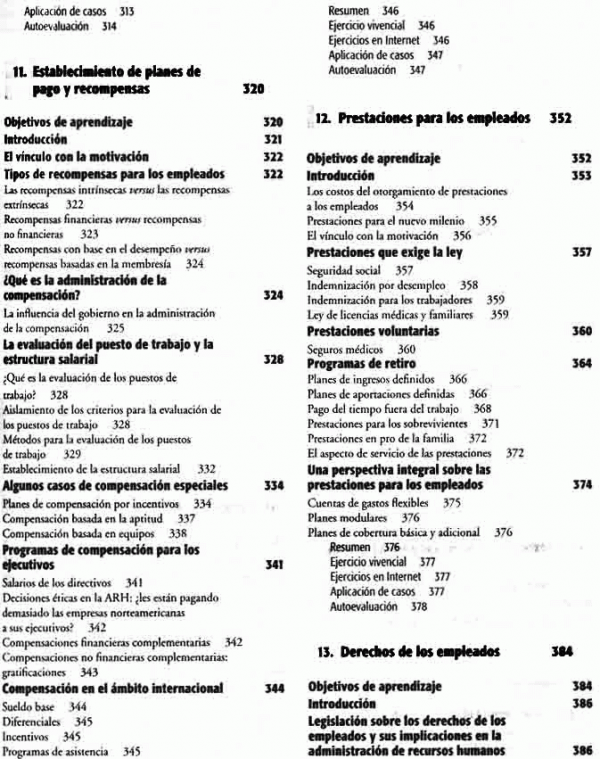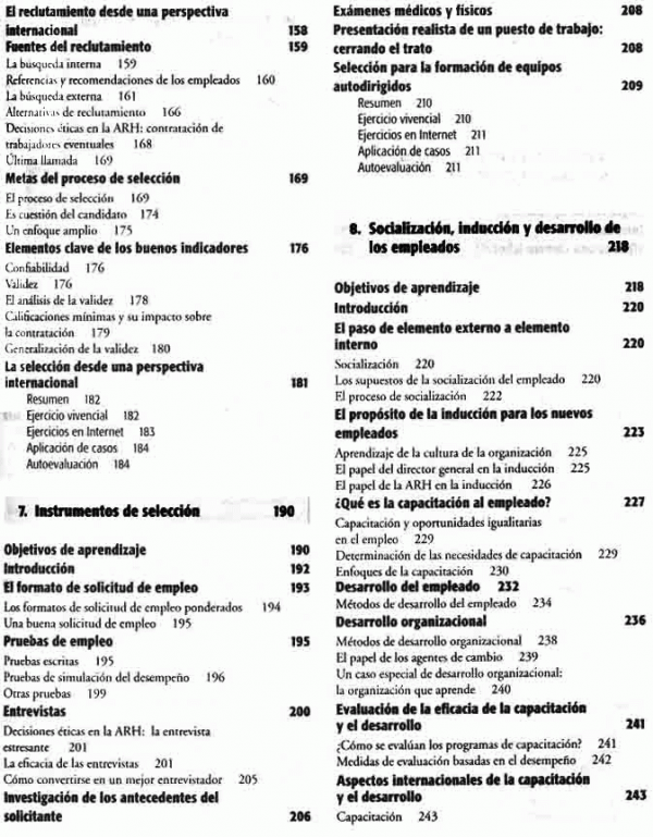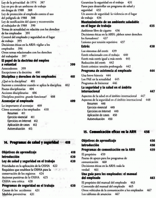 Conceptos básicos de la ARH; se tratan tópicos muy novedosos en este campo como: diversidad de la fuerza laboral, trabajo a distancia, participación del empleado, acosos sexuales, adelgazamiento o reingeniería de la organización, trabajo en equipo, diseño de puestos.