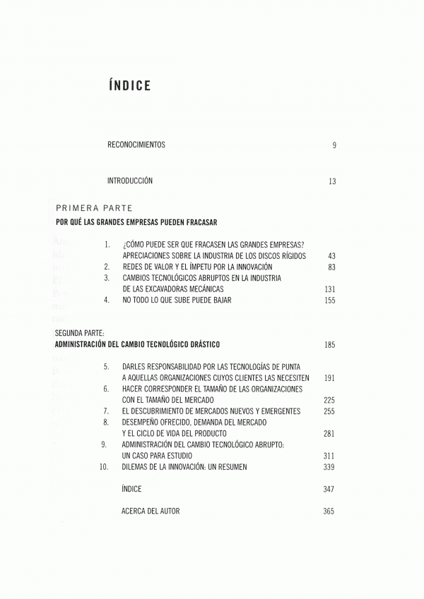 Xerox, Sears y Digital son algunas de las empresas lideres que fracasaron cuando debieron adaptarse a los abruptos cambios tecnologicos. Por que? "Precisamente porque estas firmas escucharon a sus clientes, invirtieron en nuevas tecnologias para alcanzar mas y mejores productos, y debido a que estudiaron cuidadosamente las tendencias del mercado, perdieron sus posiciones de liderazgo," sentencia Clayton M. Christensen.