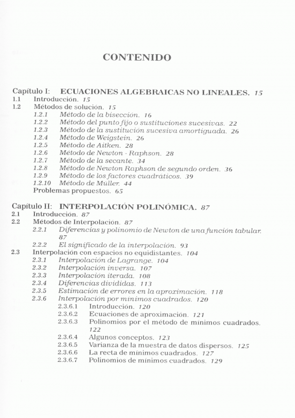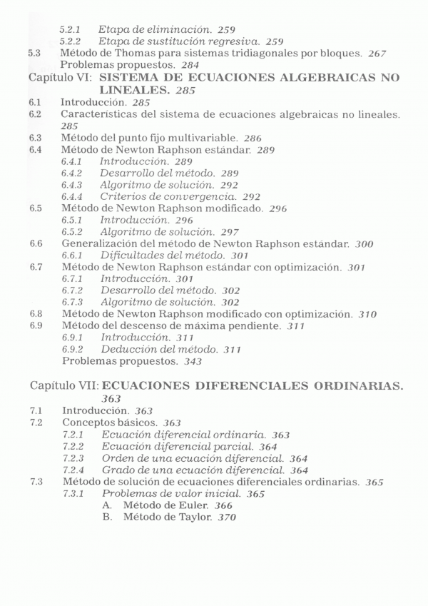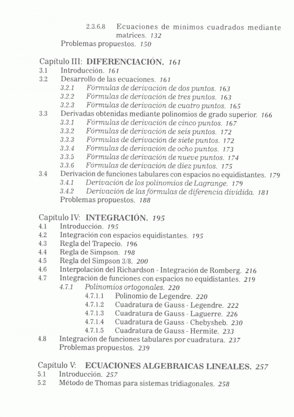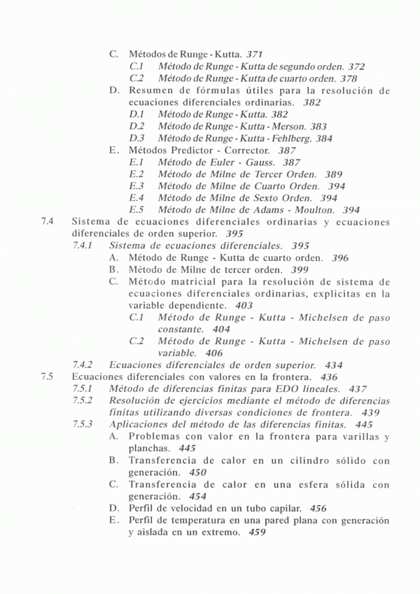 Contiene: Ecuaciones algebraicas no lineales; interpolación polinómica, diferenciación; integración; ecuaciones algebraicas lineales; sistema de ecuaciones algebraicas no lineales; ecuaciones diferenciales ordinarias; ecuaciones diferenciales parciales; volúmenes finitos y aplicaciones a problemas con Matlab.
