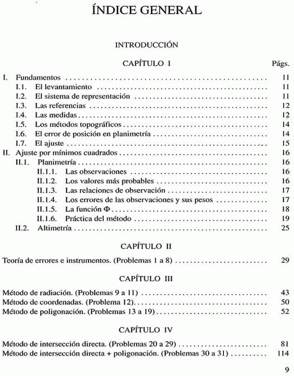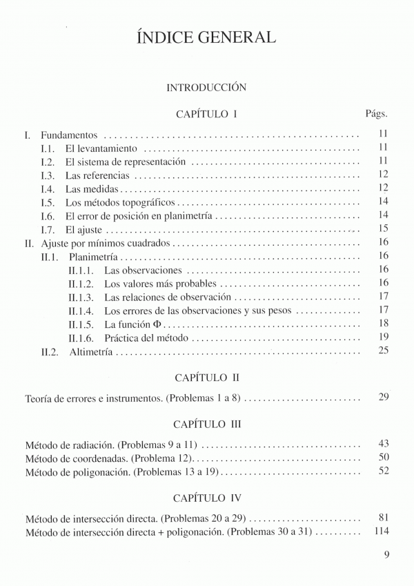 Los ocho primeros capítulos incluyen problemas de planimetría y altimetría resueltos por uno o varios métodos topográficos, cuyo ajuste por el método de relaciones de observaciones permite, tras la inclusión en el mismo de una visión distinta de algunos conceptos básicos, un mayor control del desarrollo de las operaciones y una notable rapidez y precisión.