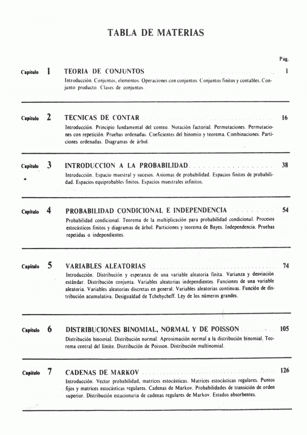 Este libro comienza con un capítulo sobre conjuntos y sus operaciones y continúa, con uno sobre permutaciones y otras técnicas de contar. Viene luego un capítulo de espacios probabilísticos y otros de probabilidad condicional e independencia.