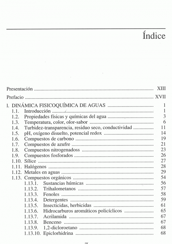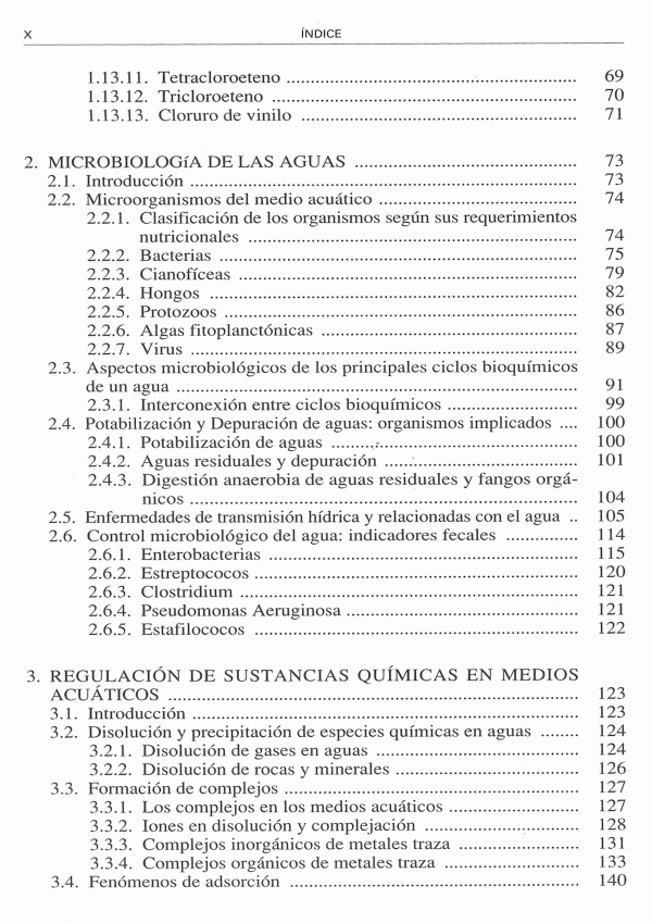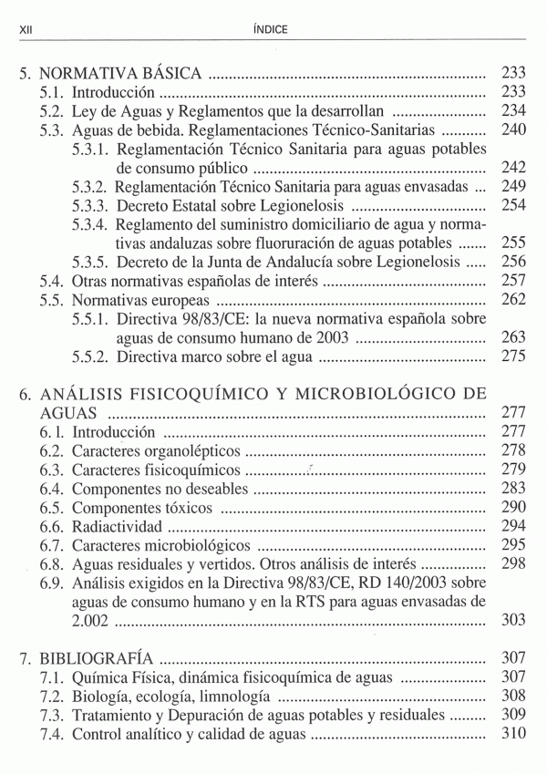 Este libro presenta en sus tres primeros capítulos una visión sistemática sobre la dinámica fisicoquímica y microbiológica natural de las aguas, desarrollando los mecanismos que determinan la presencia y la concentración final de especies químicas y microorganismos en los medios acuáticos, contemplando asimismo la posibilidad de alteración del estado natural por causas antropogénicas. El capítulo cuarto recoge las bases de los procesos de tratamiento y depuración industrial de aguas ( aguas destinadas a consumo humano, y aguas residuales domesticas e industriales) reseñando primero los principios fisicoquímicos y microbiológicos de los procesos unitarios de tratamiento, y después su aplicación práctica a escala industrial. El capítulo quinto realiza una exposición actualizada hasta 2003 de las normativas europeas, nacionales y autonómicas (C.A. Andaluza) y municipales de obligado cumplimiento en temas de aguas naturales, de consumo humano y residuales. Finalmente el capítulo recopila las técnicas aplicables en control fisicoquímico, microbiológico, virológico y radiológico de las aguas, presentando en el séptimo la bibliografía nacional e internacional más importante sobre el tema.