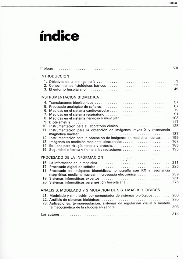 Este libro una serie "mundo electrónico" la Bioingeniería es una de las disciplinas más jóvenes de la ingeniería en la que los principios y herramientas de la ingeniería, ciencia y tecnología se aplican a los problemas presentados por la biología y la medicina. La bioingenieria es la rama de la ingeniería que implementa los principios de las tecnologías a el campo de la medicina. Se dedica fundamentelmente al diseño y construcción de equipos médicos, prótesis, dispositivos médicos, dispositivos de diagnóstico (imagenología médica) y de terapia. También interviene en la gestión o administración de los recursos técnicos ligados a un sistema de hospitales. Combina la experiencia de la ingeniería con necesidades médicas para obtener beneficios en el cuidado de la salud. Puede ser definida como “la aplicación de técnicas y principios de ingeniería al campo médico”.