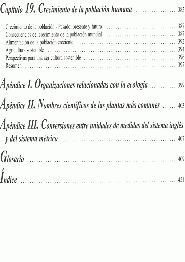 Bibliografía / Incluye apéndice I. Organizaciones relacionadas con la ecología / Apéndice II. Nombres científicos de las plantas más comunes / Apéndice III. Conversiones entre unidades de medidas del sistema inglés y del sistema métrico / Glosario / índice.