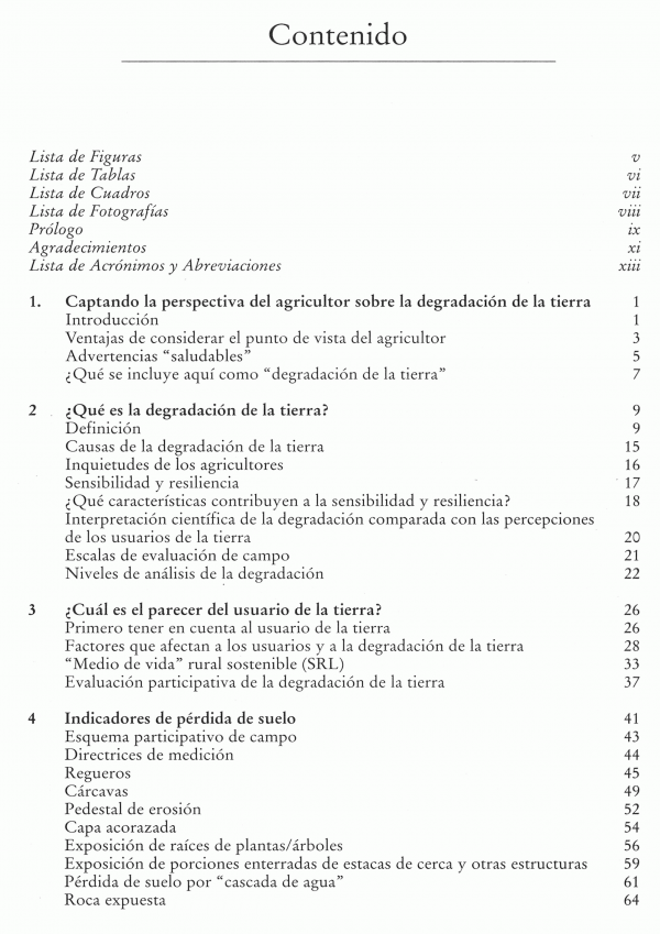 Este manual muestra cómo calcular indicadores tales como los de pérdida de suelo y explica la interpretación de los resultados y, en particular, como las combinaciones de diferentes indicadores pueden dar evidencia concluyente de la severidad de la degradación de la tierra. El libro se enfoca al entendimiento de la interacción de los agricultores con la tierra, y cómo se pueden asegurar la protección ambiental, la seguridad de disponer de alimentos y el bienestar de los usuarios rurales de la tierra.