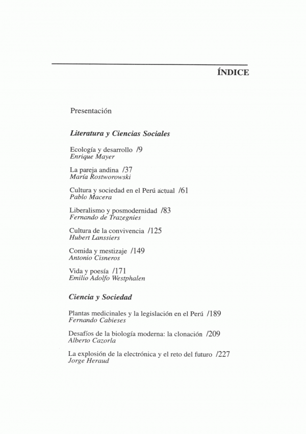 Los muy destacados médicos Cabieses y Cazorla completan esta suerte de mirada abarcante del Perú, el primero contrastado su sabiduría sobre las plantas medicinales con los efectos de la globalización, y el segundo instalado en el futuro, plantea las oportunidades abiertas por la biología moderna.