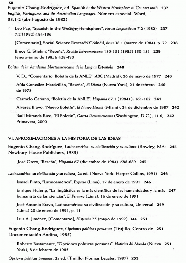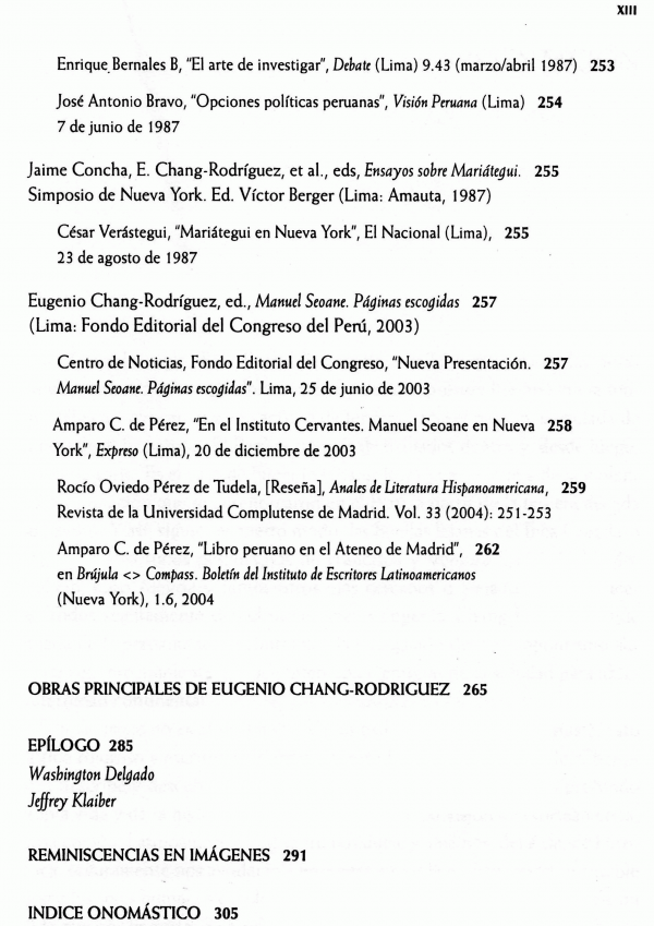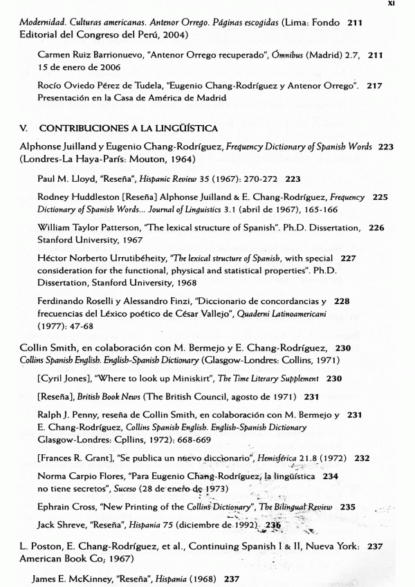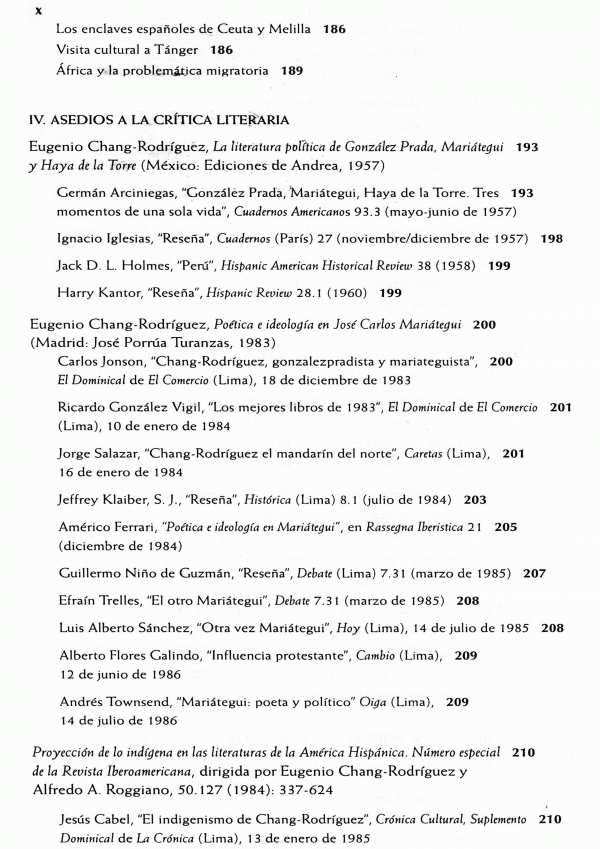 Incluye revisiones por otras personas de obras de Chang-Rodríguez en crítica literaria, lingüística y la historia de las ideas.