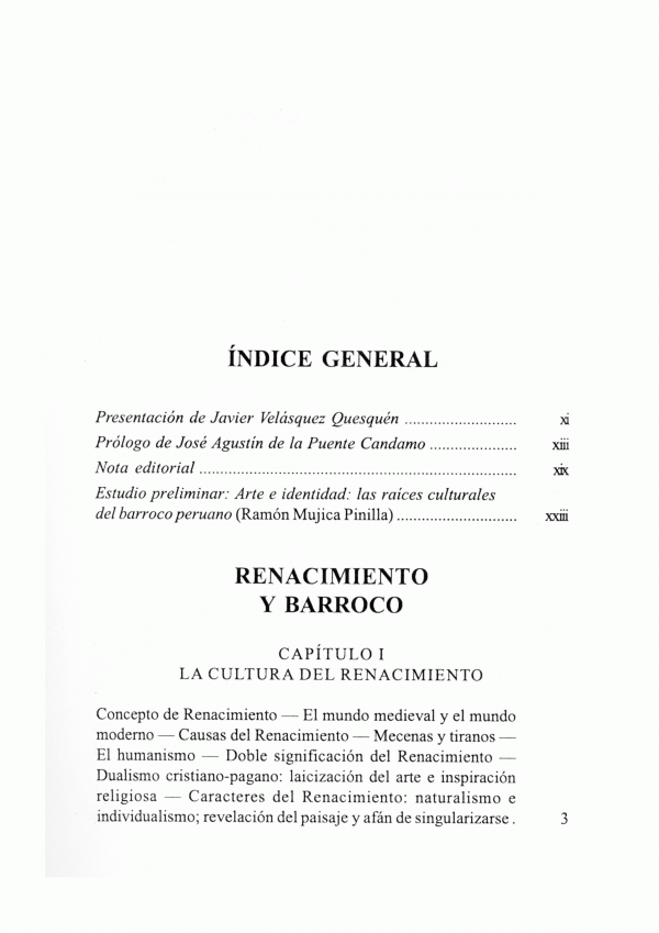 Este libro expresa el amplio conocimiento que sobre la tradición occidental tiene Raúl Ferrero, la historia del Renacimiento, asimismo al complejo cultural Barroco y a la implantación de ambos en América. Esta edición incluye en los prolegómenos, el notable ensayo de Ramón Mujica sobre el Barroco en el Virreinato peruano, que permite actualizar la comprensión de este decisivo componente cultural en la formación de la tradición criolla peruana.