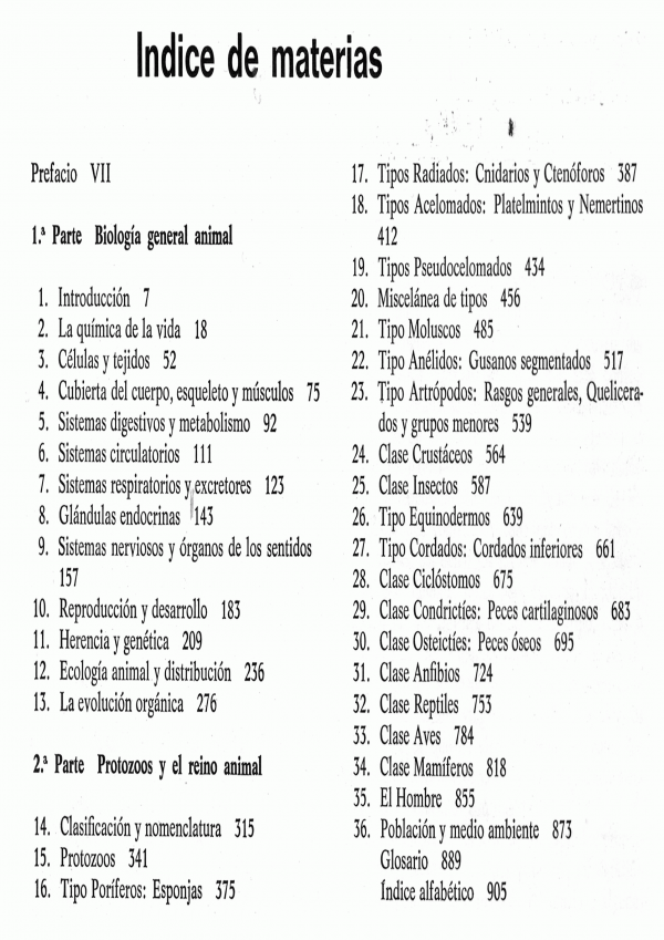 Este libro es una introducción general a la zoología nivel universitario. La materia de estudio esta distribuida de forma que facilite su lectura, ya sea esta con carácter de consulta o en relación con trabajos de laboratorio. La primera parte del libro trata de los principios generales de la biología animal. Se detallan las diferentes estructuras del cuerpo y su organización en sistemas especiales para llevar acabo procesos esenciales para la vida. En la segunda parte cada capitulo describe la estructura y fisiología de tipos comunes y representativos pertenecientes a cada grupo principal, desde los protozoos unicelulares hasta el hombre.