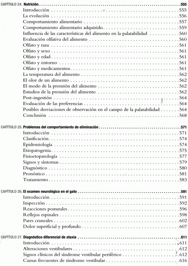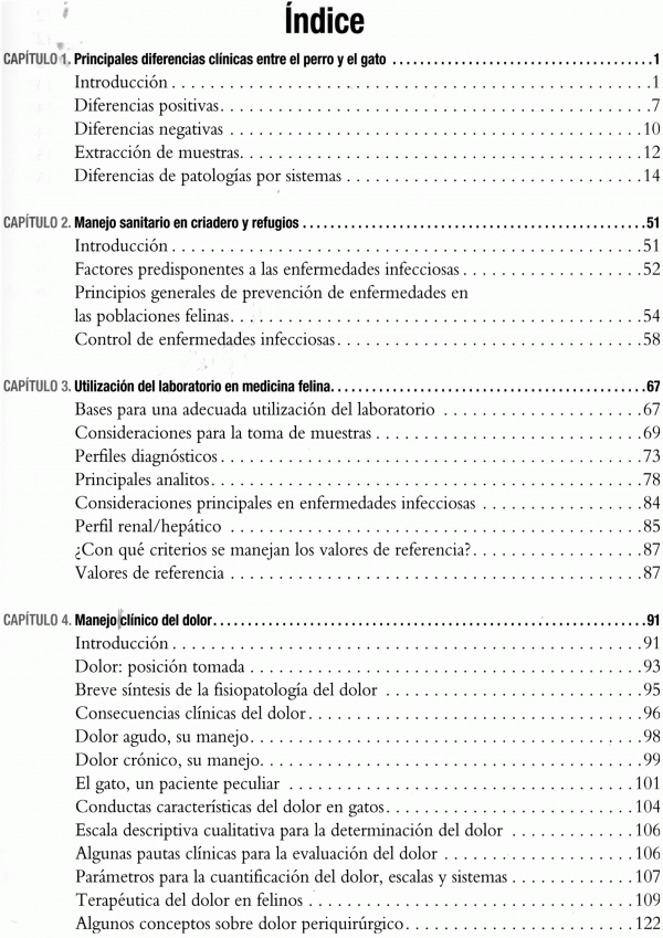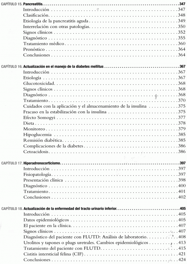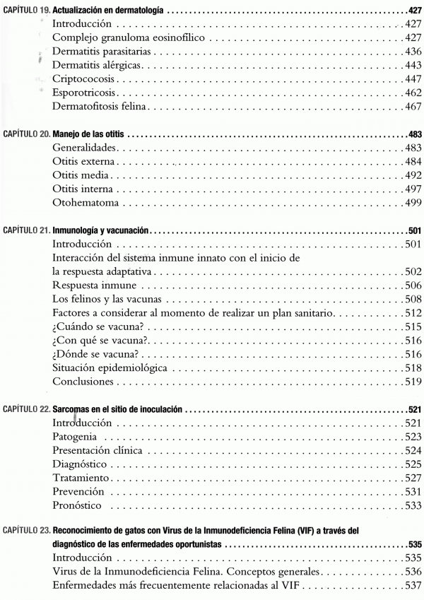 Hiperadrenocorticismo. Actualización de la enfermedad del tracto urinario inferior. Actualización en dermatología. Manejo de las otitis. Inmunología y vacunación. Sarcomas en el sitio de inoculación. Nutrición. Problemas del comportamiento de eliminación. El examen neurológico del gato.