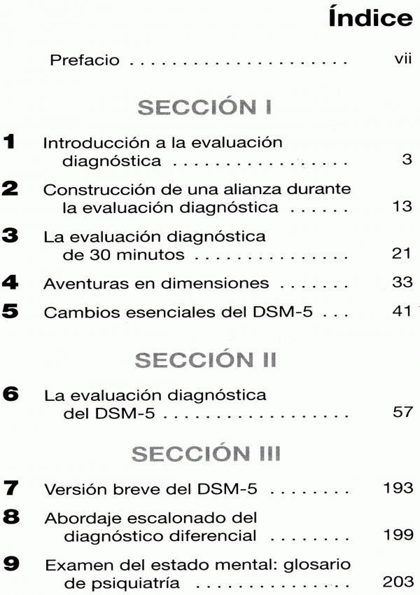 La obra, que comienza con una introducción al examen diagnóstico, explica sus objetivos, aporta una estructura eficiente para aprender a realizarlo, repasa las preguntas de criba y, por último, aborda la manera en que el DSM-5, con su enfoque actualizado del diagnóstico y la clasificación, influye en el desarrollo de la evaluación, Además, en ella se analizan las diferencias que presenta el DSM-5 respecto al DS M-IV (y DSM-IV-TR). El capitulo dedicado a la evaluación diagnostica del DSM-5, Núcleo principal de la guía, acompaña al lector a través de una exploración diagnostica completa que incluye preguntas de seguimiento para cada una de las categorías diagnostica contenidas con el DSM-5.