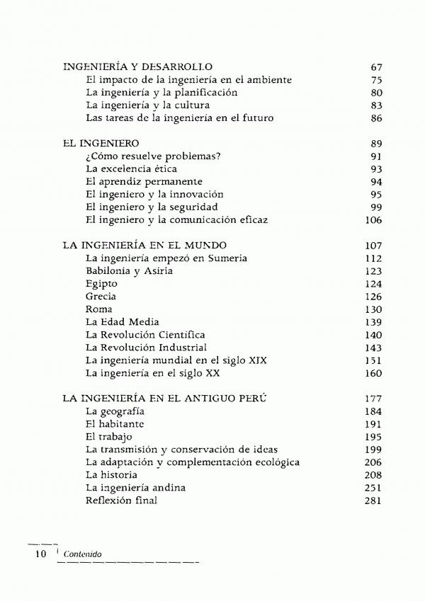 El autor nos hace recorrer la historia y la forma en que diferentes culturas entre ellas las que se dieron en el antiguo Perú pusieron de manifiesto sus conocimientos y su concepción del mundo a través de distintas obras de ingeniería. Seguidamente aborda temas tales como la relación de la ingeniería con el desarrollo, la planificación y la cultura. Posteriormente, trata los principales elementos que es necesario enfatizar para la formación de ingenieros capaces de enfrentar con éxito los retos que la realidad les plantea, así como los temas que es necesario tomar en cuenta en el ejercicio profesional de la ingeniería. Allí destaca la importancia del cuidado puesto en el diseño de la obra y el valor de las fallas como elementos a partir de los cuales se hace posible cuestionar conceptos y prácticas cuyo valor era incuestionable, para superarlos. Finalmente, se detiene en el valor de la ética, en tanto guía indispensable para todo profesional de la ingeniería.