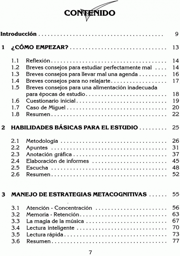 Contenido Introducción I. Cómo empezar 1.1 Reflexión 1.2 Breves consejos para estudiar perfectamente mal 1.3 Breves consejos para llevar mal una agenda 1.4 Breves consejos para no relajarse 1.5 Breves consejos para una alimentación inadecuada para épocas de estudio 1.6 Cuestionario inicial 1.7 Caso de Miguel 1.8 Resumen