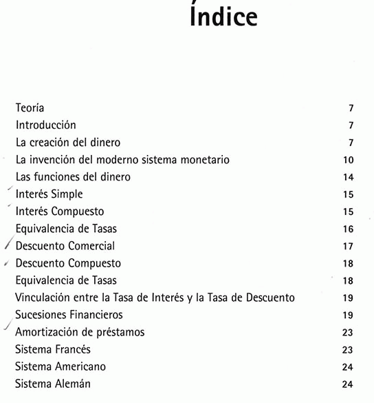 Con una amplia gama de problemas y casos reales sobre matemática financiera, este libro llena un gran espacio vacío, que se contrapone, en buena medida, con la bibliografía de esta disciplina cuyos aspectos teóricos son más relevantes. Por esta razón, se confeccionó una breve introducción sobre el significado del dinero y un glosario de fórmulas que se aplican a lo largo de este trabajo. La matemática financiera pretende ser una herramienta útil para las operaciones comerciales con capitalización simple y compuesta en todos sus aspectos: valuación de fondos en momentos determinados, tasas de interés y descuento, con sus equivalencias, el correcto empleo de la periodicidad y la siempre práctica visión de los sistemas de amortización de préstamos que permite controlar al tomador de decisiones las distintas alternativas de financiación.