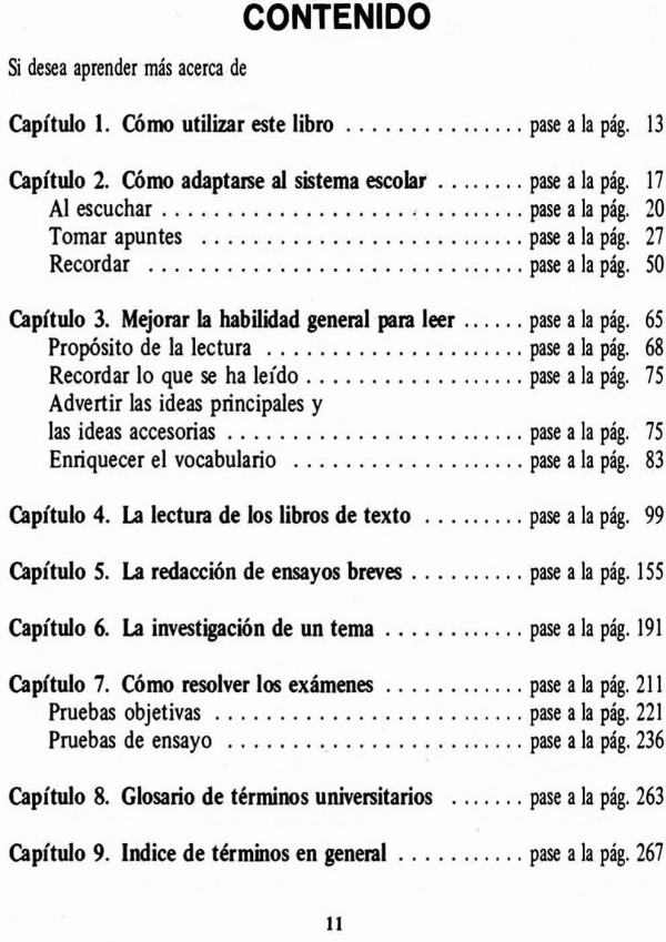 Cómo utilizar éste libro. Cómo adaptarse al sistema escolar. Mejorar la habilidad general para leer. La lectura de los libros de texto. Mejorar la habilidad general para leer. Cómo resolver los exámenes. La investigación de un tema.