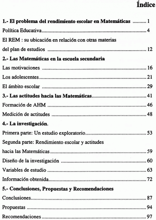 La problemática de las matemáticas en la escuela secundaria. Figuras. Notas. Bibliografia. Resumen de contenido: El problema del rendimiento escolar en matemáticas. Las matemáticas en la escuela secundaria. Las actitudes hacia las matemáticas. La investigación. Un estudio exploratorio. diseño de la investigación. Variables de estudio. Información obtenida. Conclusiones. Apéndices.
