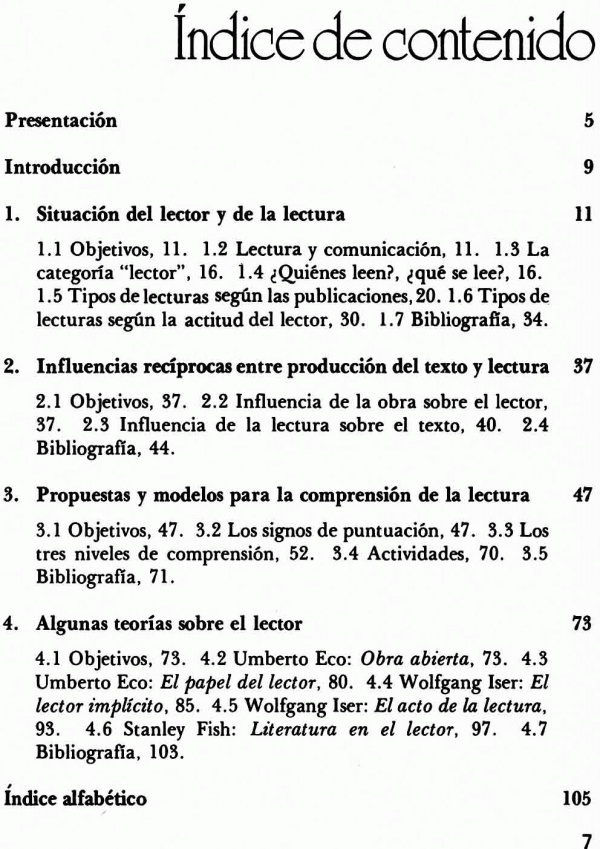 Este libro está dirigido al sector estudiantil y a personas interesadas en obtener el máximo provecho de un texto narrativo, poético o ensayístico. El autor desarrolla la obra desde distintos puntos de vista: la situación del lector, la influencia recíproca entre éste y el texto, la importancia de la sociedad y del lector en la obra del escritor, la lectura correcta (interpretativa y crítica), entre otros. Como novedad, la obra contiene un resumen de las teorías más recientes sobre el papel del lector en el proceso de aprendizaje de la lectura, desarrolladas por destacados filósofos y ensayistas como Umberto Eco, Wolfang Iser y Stanley Fish.