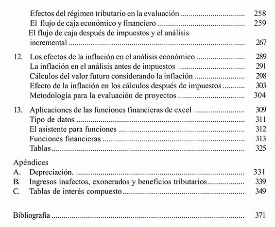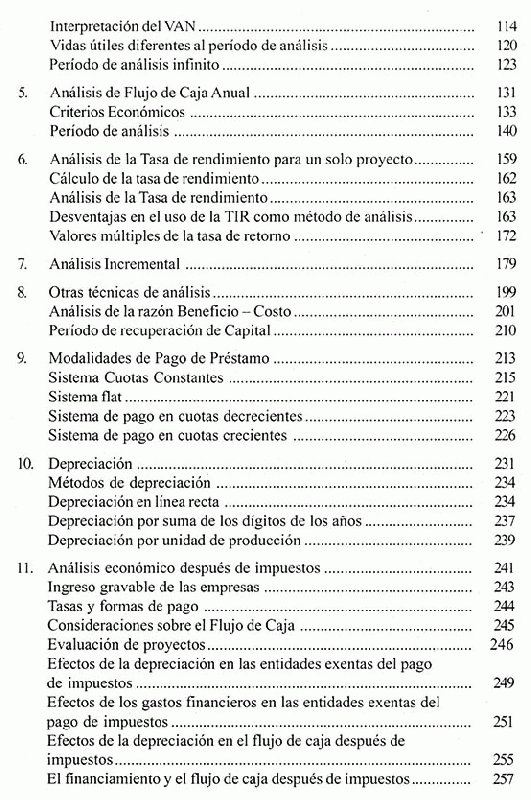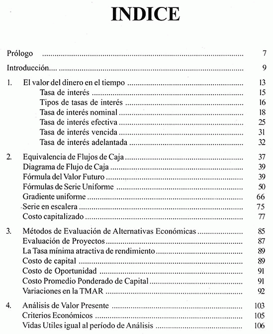 Se inicia con el manejo de tasas de interés, luego en los siguientes capitulo se describe la parte principal de análisis económico , la equivalencia del flujo de caja, estos conceptos no permitirán comprender y sentar las bases de una correcta evaluación del proyecto.
