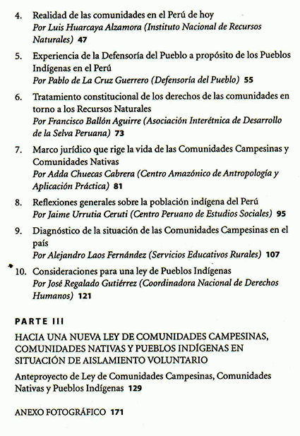 Resumen: El libro Desarrollo comunal en la era global. Derecho indígena en el siglo XXI, constituye un aporte a nuestra patria y refleja el resultado del trabajo de más de un año que realizará la Comisión Especial Revisora de la Legislación sobre Comunidades Campesinas y Nativas, creada por la ley 28150 y presidida por la Congresista Paulina Arpasi, primera representante indígena en la Representación Nacional.