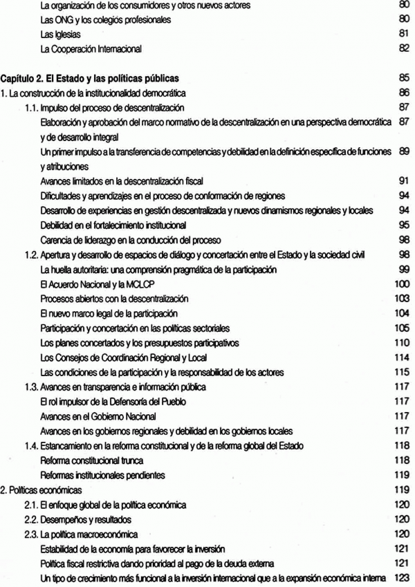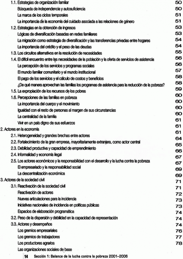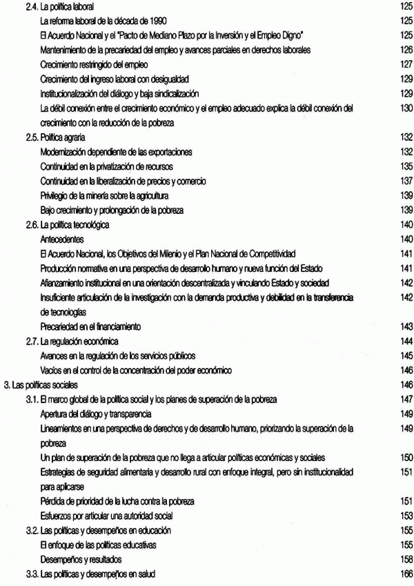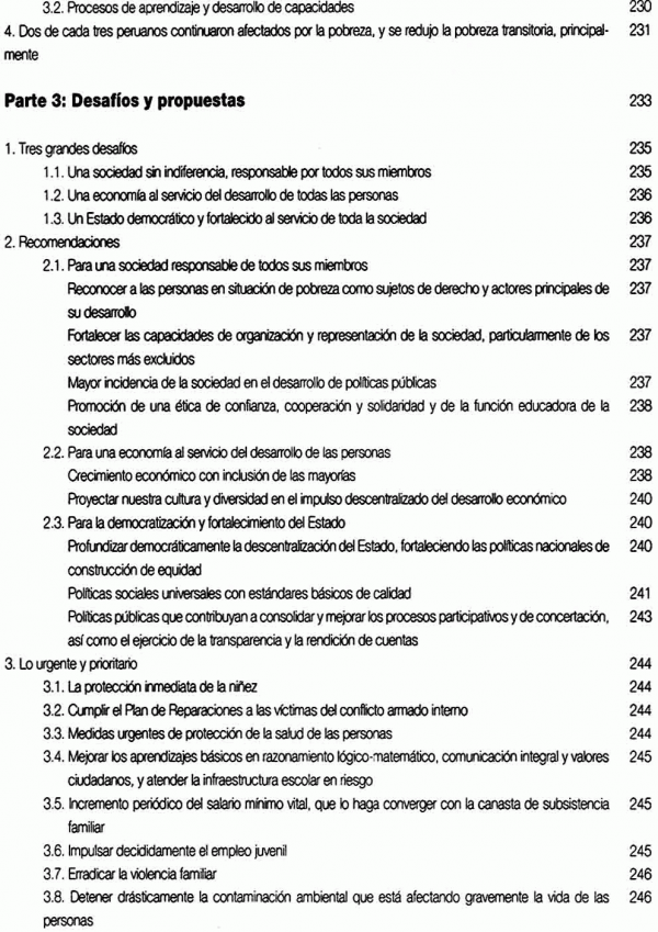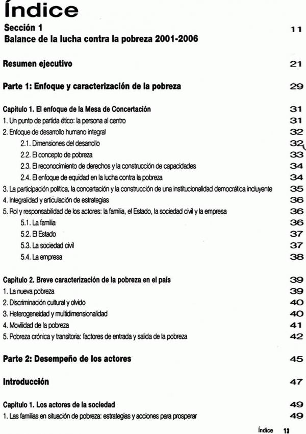 Cubre el periodo 2001-2006. Toma como punto de partida el enfoque integral de la pobreza que sustenta la MCLP, desde una perspectiva ética y de desarrollo humano, evalúa el desempeño de los actores, como el Estado y la Sociedad Civil, e incluye la función cumplida por la propia MCLP. El documento presenta 2 secciones con los siguientes contenidos: Sección 1, Balance de la lucha contra la pobreza 2001-2006: Enfoque y caracterización de la pobreza, Desempeño de los actores, Desafíos y propuestas; Sección 2, El papel de la Mesa de Concertación para la Lucha contra la Pobreza: Contexto, creación y construcción nacional de la MCLP, El papel desempeñado por la MCLP, Logros y límites en el trabajo de la Mesa, Los desafíos para la Mesa en el próximo periodo; Apendice: Propuestas concertadas para el desarrollo humano, la descentralización y la lucha contra la pobreza
