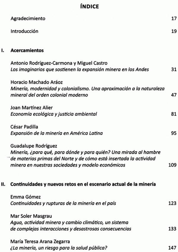 Este libro presente una serie de propuestas de reformas políticas urgentes para regular la actividad minera en el país generadas a raíz de los conflictos. A la vez, plantea un debate de fondo sobre el desarrollo extractivista, las propuestas de cambio y las alternativas de vida.