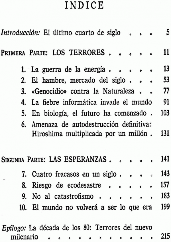 En el presente libro, el conocido divulgador científico Manuel Calvo Hernando pasa revista a las principales amenazas que, para el individuo y la sociedad, se derivan del uso individuo y la sociedad, se deriva del uso indebido de la ciencia y la tecnología, par analizar luego las alternativas y soluciones, las medidas colectivas que hay que tomar urgentemente para conjugar dichas amenazas.