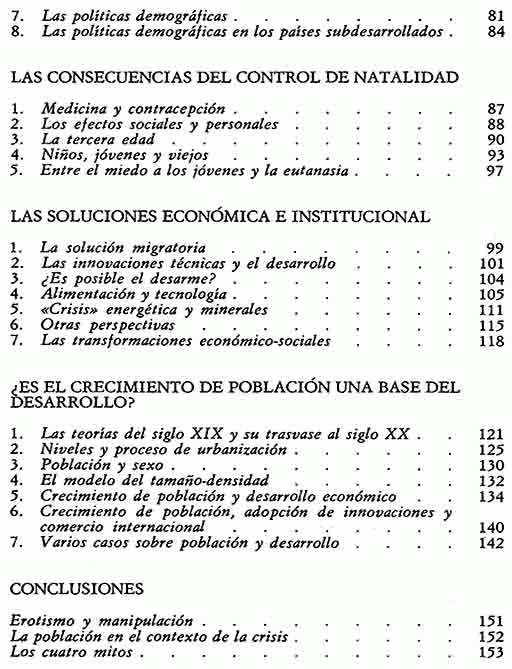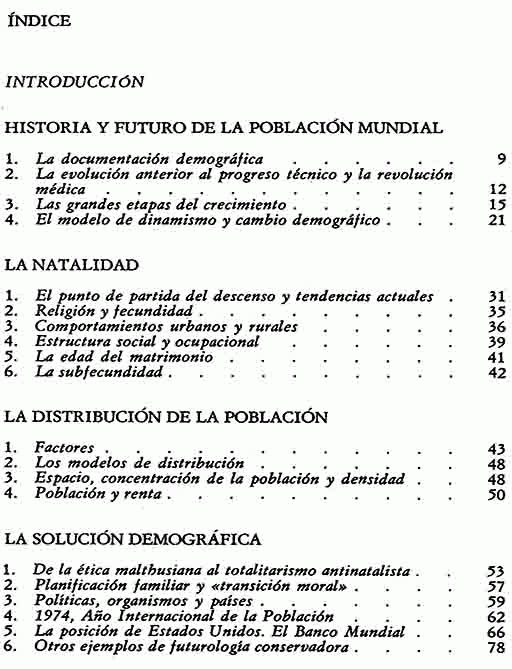 El libro contiene una visión que pretende ser clara y sencilla, de la evolución demográfica y sus causas, así como también de las pautas con arreglo a las cuales los hombres se distribuyen sobre la superficie terrestre.