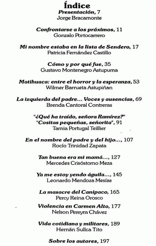 El presente libro reúne un conjunto extraordinario de testimonios que aproximan al lector a la dolorosa experiencia de los sobrevivientes de la experiencia de los sobrevivientes de la violencia de las ultimas dos décadas. Periodo en el que se escarbaron conflictos de larga data y se desataron fuerzas siniestras que produjeron escenas de muerte, dolor y desesperanza.