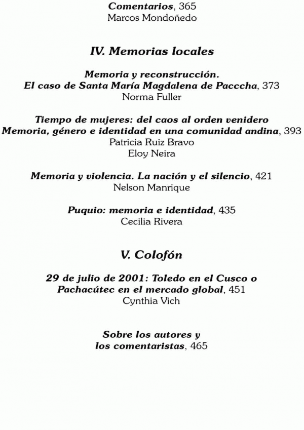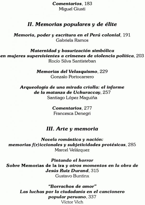 Examina la dinámica de las mutuas exclusiones y la consecuente fragmentación de la sociedad peruana. El círculo del olvido y la repetición. Las dificultades para aprender. Pero también se examinan las luchas por el recuerdo y la integración, por el logro de una sociedad donde la diferencia no evoque la jerarquía sino la equidad. Muestra las heridas del país como el revés de sus posibilidades. El seminario del que resulta este libro congregó a investigadores de diferentes generaciones y disciplinas unidos por la inquietud de responder por qué lo que Basadre llamaba el “querer existencial nacional” no se logra plasmar de manera que la “promesa de la vida peruana” permanece todavía como una virtualidad anhelada.