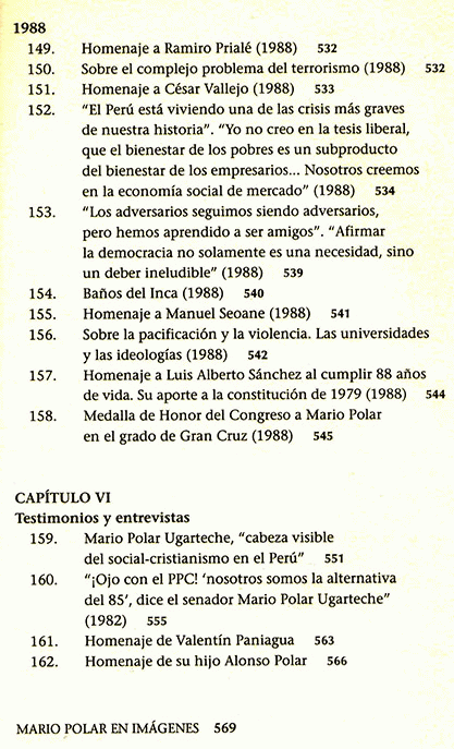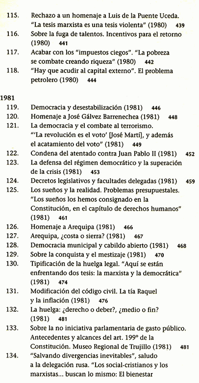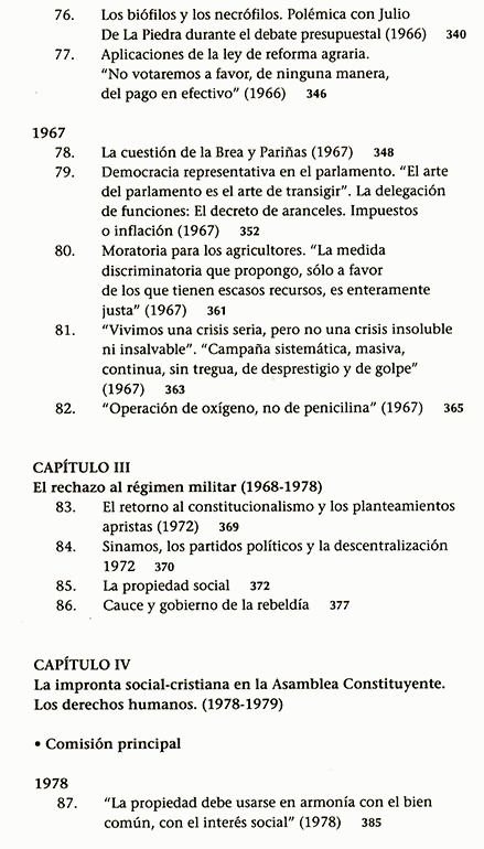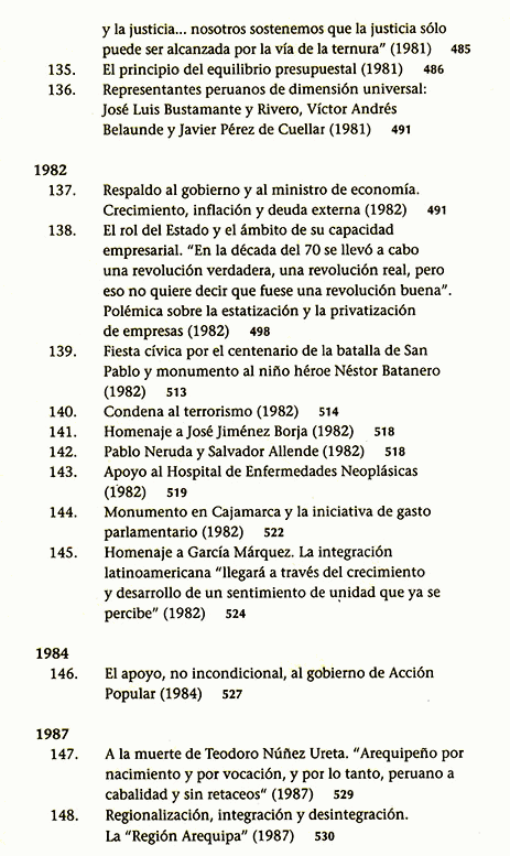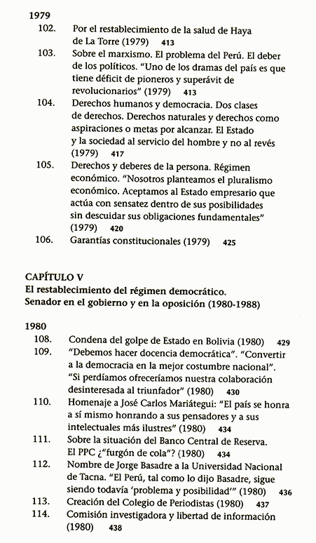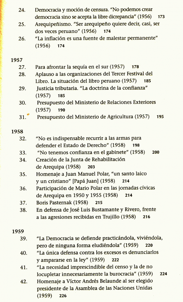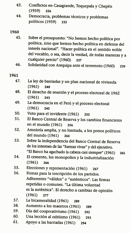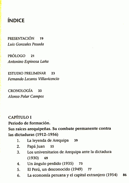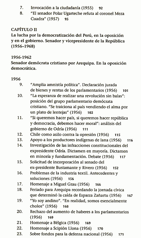 Contiene proclamas de juventud, artículos de análisis nacional, discursos de cátedra y transcripciones de sus intervenciones parlamentarias, y a su lado, muestras del quehacer literario al que también se consagró, con un lirismo nostálgico y terso, el político nacido en Arequipa.