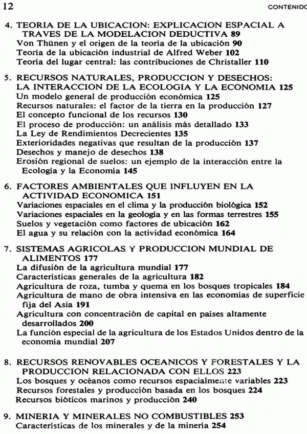 En este libro se explican temas tales como la evolución de la economía global, la teoría de la ubicación, recursos naturales y la interacción de la ecología con la Economía, los factores ambientales que influyen en la actividad económica, los sistemas agrícolas, los recursos marinos, la minería, los energéticos, la industria el transporte y las ciudades; todos ellos analizados desde el punto de vista de ubicación y el ambiente.