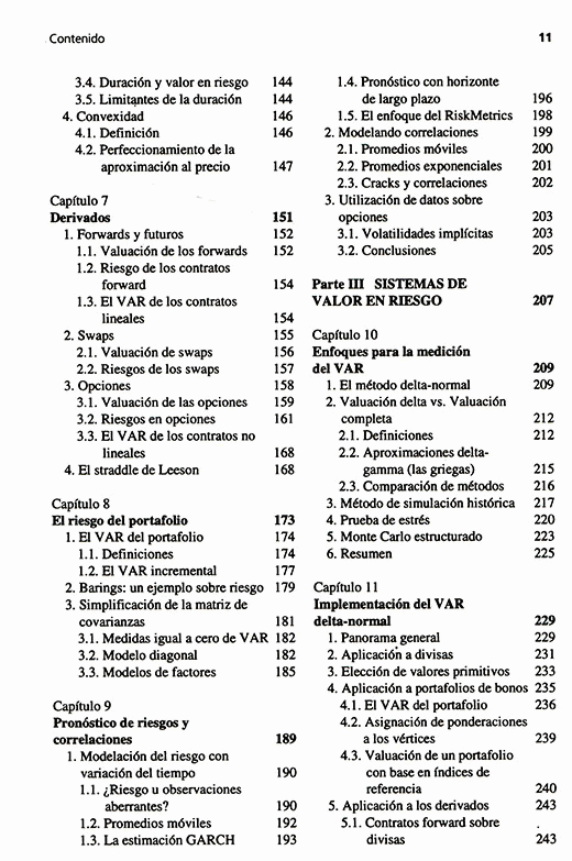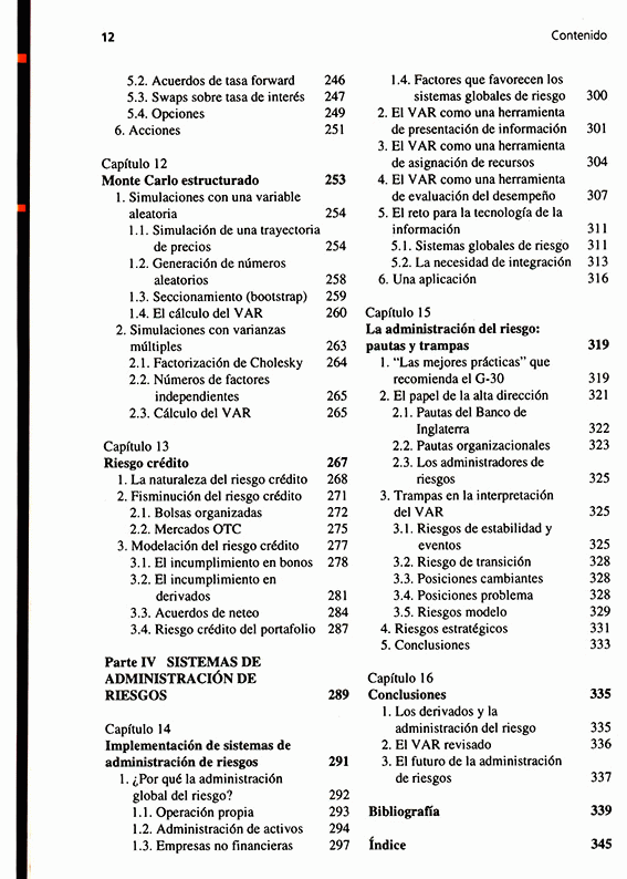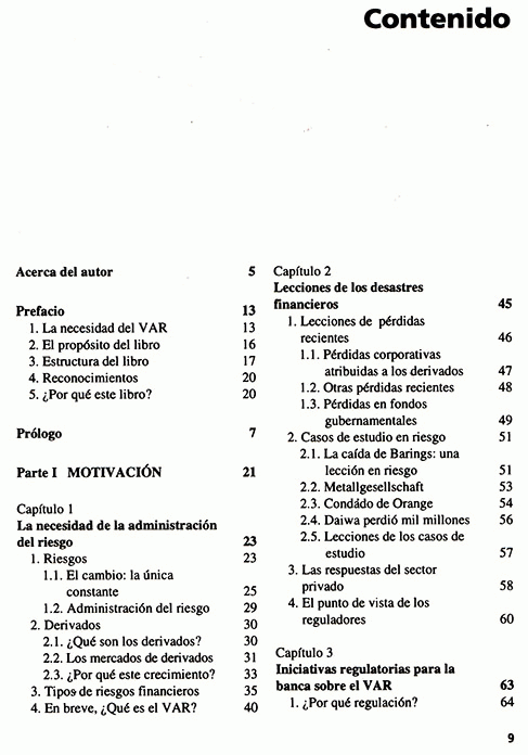 Es un hecho que el entorno regulatorio para la administración de riesgos financieros en este siglo, se basará en el concepto de valor en riesgo (VAR). Cualquier banco, casa de bolsa, empresa privada o entidad gubernamental tendrá que establecer la exposición al riesgo en sus balances en términos del VAR, lo que exigirá un conocimiento elemental sobre probabilidades y ganancias, que típicamente es ignorado en los sistemas contables anacrónicos. El libro de Valor en Riesgo de Phillipe Jorion proporciona un interesante panorama de esta apasionante área de las finanzas aplicadas.