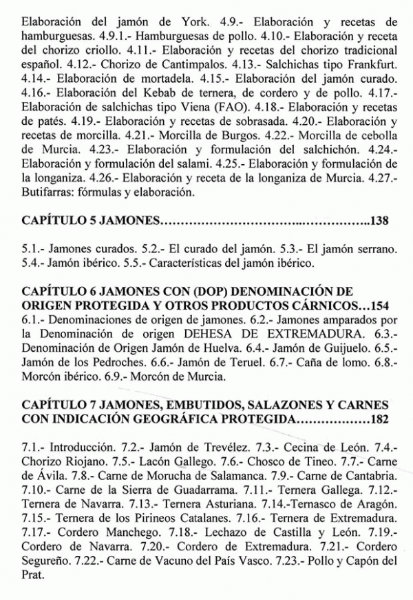 Los primeros capítulos ofrecen datos generales sobre técnicos y accesibles sobre la composición de la carne y de los productos cárnicos y sus propiedades nutritivas. También se trata el funcionamiento de un matadero y una industria cárnica, para posteriormente entrar de lleno en la ciencia y gastronomía de carnes, embutidos y jamones. Este libro es interesante para las industrias cárnicas en su afán de rentabilizarlas, pues le ofrece ideas como el ofrecer turismo gastronómico asociado a sus industrias, igual que el enoturismo o el oleoturismo.
