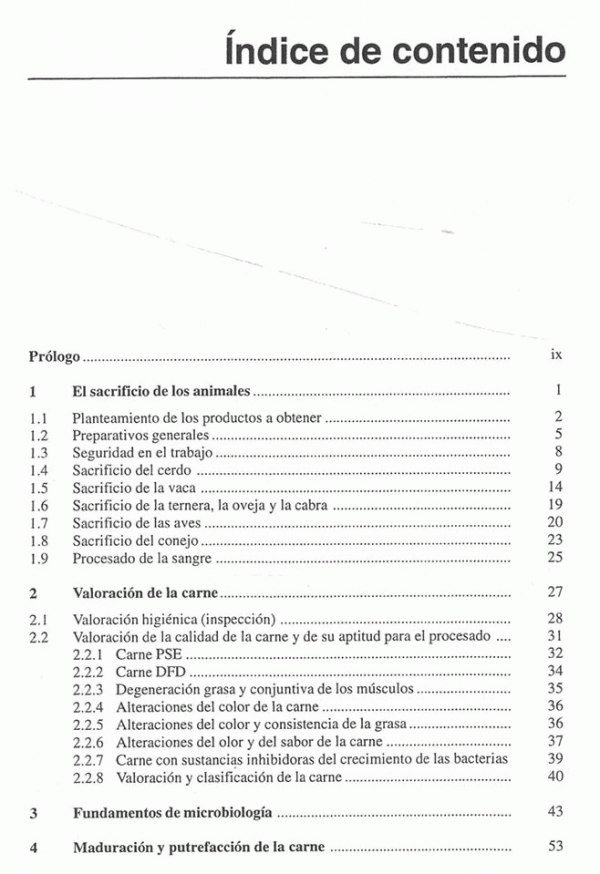 Contiene: El sacrificio de los animales. Valoración de la carne. Fundamentos de microbiología. Maduración y putrefacción de la carne. Despiece de la canal. Las tripas. Embutido crudo. Embutidos cocidos. Embutidos escaldados. Productos curados de larga duración. Productos cárnicos curados y cocidos. Ensaladas, productos gelatinosos, fiambres en gelatina y otras especialidades. Conservación de la carne y de los productos cárnicos. Condimentos. Intoxicaciones alimentarias. Mataderos y salas de despiece no industriales. Selección de disposiciones legales.