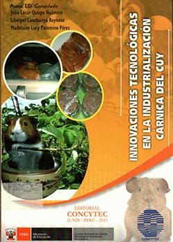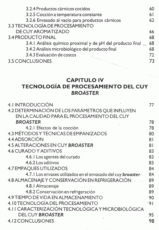 Resumen: Descripcion zoologica del cuy, tipos de cuy, características físicas y químicas, diagnostico situacional de la crianza de cuy, exportacion de cuy, evaluación de los métodos de sacrificio en el beneficio del cuy, elaboración de cuy aromatizado y envasado al vacío, tecnología de procesamiento del cuy broaster, elaboración de un producto cárnico marinado y ahumado, embutido deshidratado tipo cabanossi a partir de la carne de cuy, tecnología de elaboración de cuy prensado, tecnología de procesamiento de patè de cuy, tecnología de procesamiento de tripas de cuy saladas - deshidratadas.