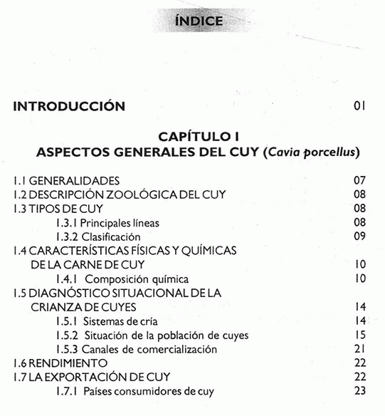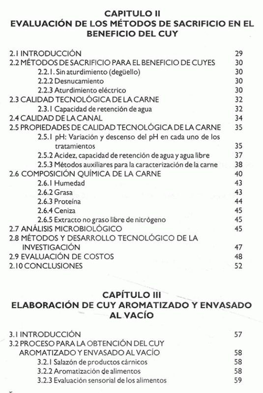 Descripcion zoologica del cuy, tipos de cuy, características físicas y químicas, diagnostico situacional de la crianza de cuy, exportacion de cuy, evaluación de los métodos de sacrificio en el beneficio del cuy, elaboración de cuy aromatizado y envasado al vacío, tecnología de procesamiento del cuy broaster, elaboración de un producto cárnico marinado y ahumado, embutido deshidratado tipo cabanossi a partir de la carne de cuy, tecnología de elaboración de cuy prensado, tecnología de procesamiento de patè de cuy, tecnología de procesamiento de tripas de cuy saladas - deshidratadas.