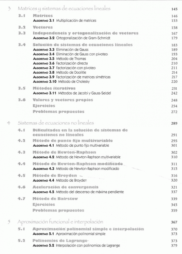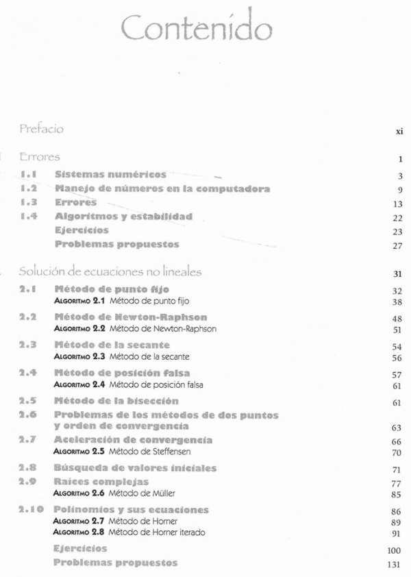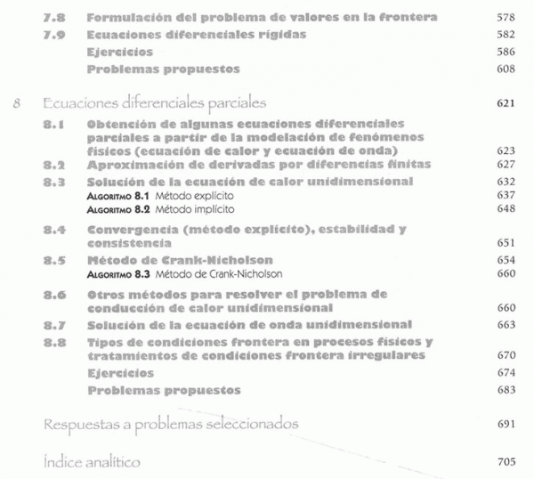 Errores, ecuaciones no lineales, matrices y sistemas de ecuaciones lineales, sistemas de ecuaciones no lineales, aproximación funcional e interpolacion, integración y diferencia numérica, ecuaciones diferenciales ordinarias, ecuaciones diferenciales parciales, respuestas a problemas seleccionados.