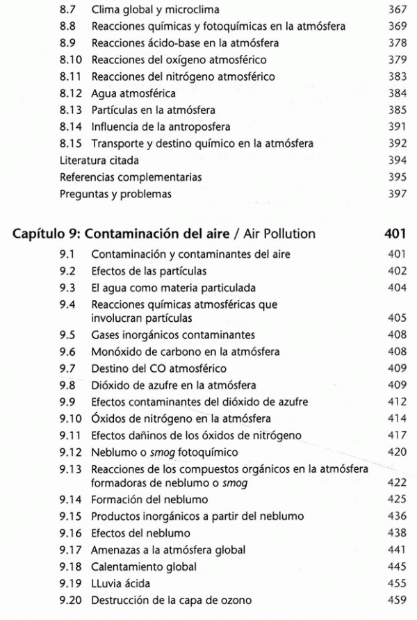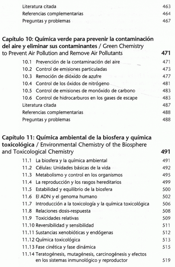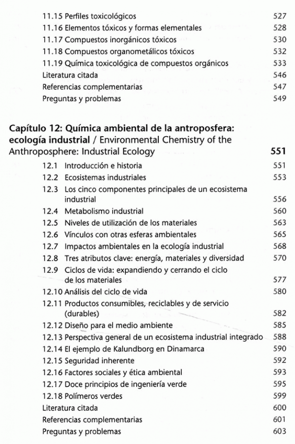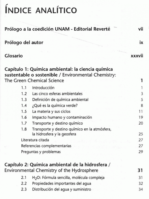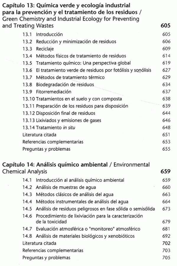 Este nuevo libro de S. Manahan es una introducción concisa a la Química ambiental que está estrechamente relacionada con sus textos sobre Química verde y Ecología industrial. El concepto de Química ambiental va más allá de la mera discusión sobre la contaminación y los problemas ambientales y pretende enfocar los conocimientos actuales en la resolución de esos problemas basándose en la sostenibilidad y en la prevención de la contaminación. De esta forma, se invocan constantemente disciplinas emergentes como la Ecología industrial, la Química verde y la Ingeniería verde.