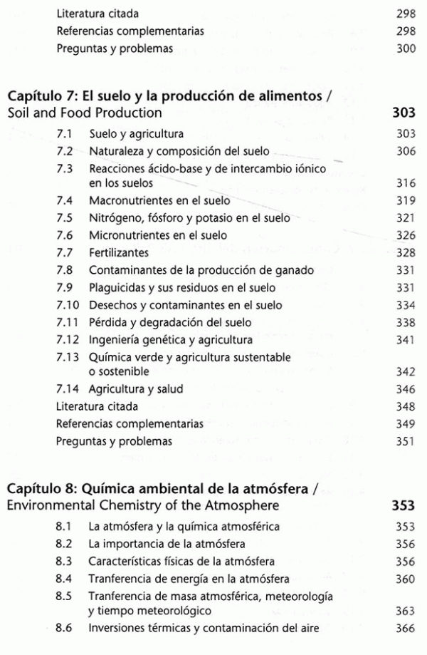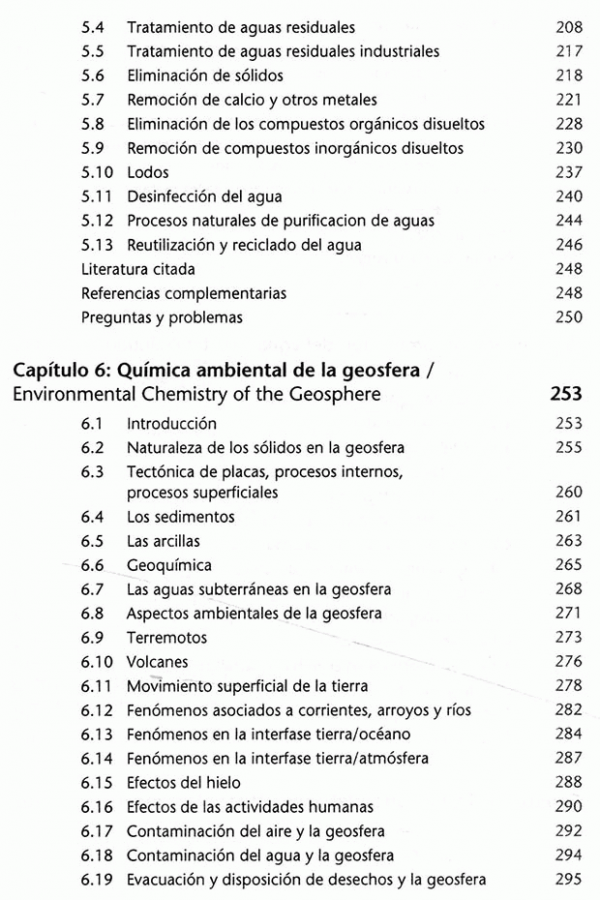 El libro se divide en cinco partes. En cuatro de ellas, la hidrosfera, la geosfera, la atmosfera y la biosfera, se revisan temas que han sido ampliamente tratados por las ciencias ambientales. Sin embargo, en la ciencia ambiental moderna es esencial reconocer y tratar un nuevo tema: la antroposfera, que es el espacio donde habitan y realizan sus actividades los seres humanos. La mayoría de los problemas ambientales se deben a las actividades humanas que provocan contaminación, despilfarran recursos y dañan el medio ambiente. La preservación y mejoramiento del ambiente no sólo deben minimizar el daño ocasionado por las actividades antroposféricas, sino también dirigir esas actividades de forma tal que refuercen y conserven el medio que nos rodea.