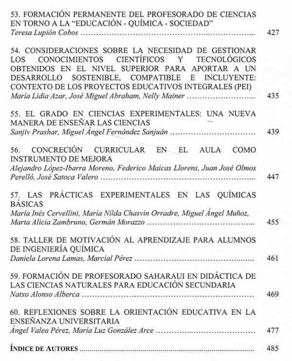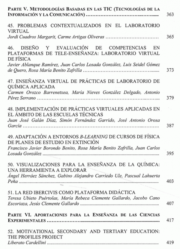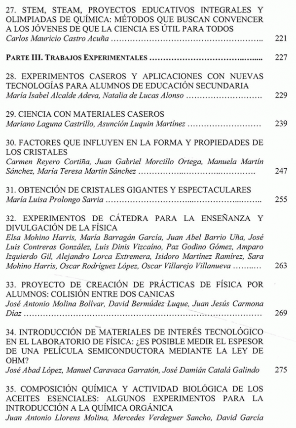 Divulgación científica: enfoques y experiencias, recursos educativos para la física y la química, trabajos experimentales, competencias genéricas y enseñanza de las ciencias experimentales, metodologías basadas en las TIC, aportaciones para la enseñanza de las ciencias experimentales.