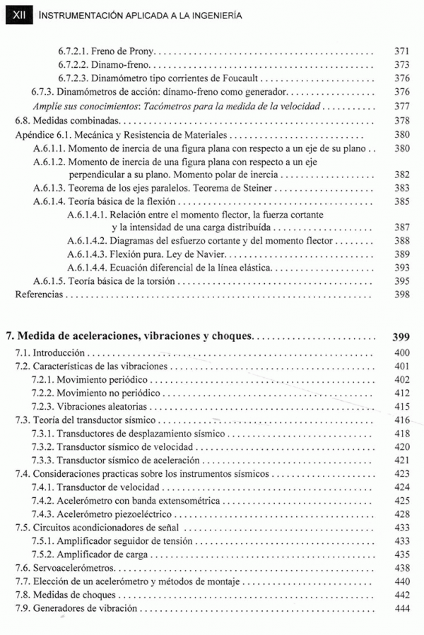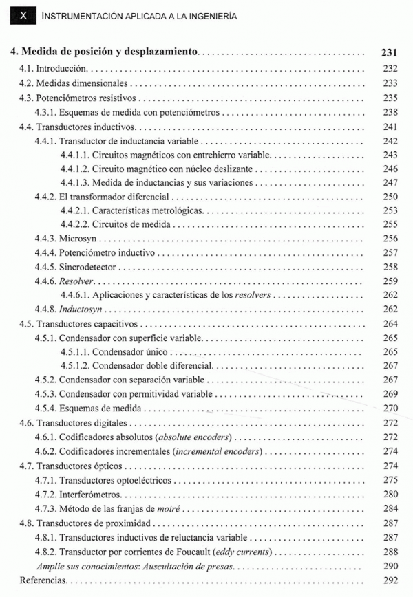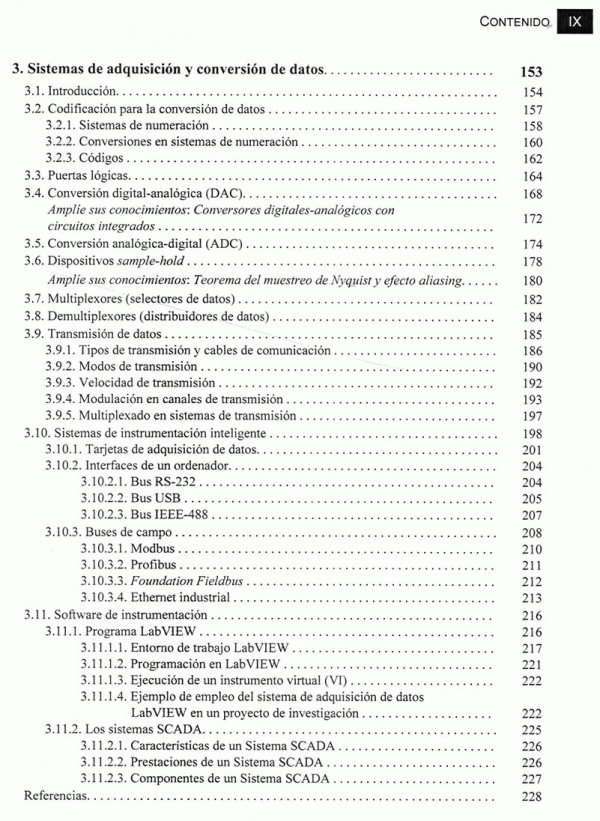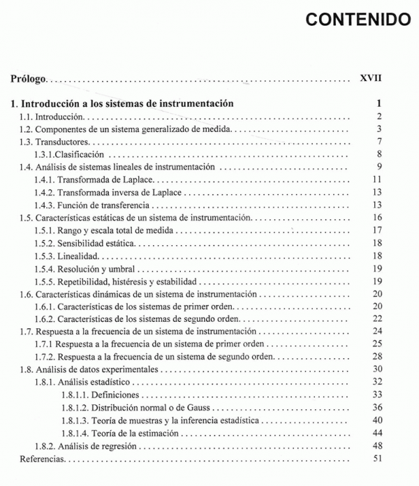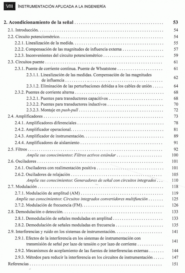 La obra consta de diez capítulos que abarcan la mayoría de las aplicaciones que se utilizan en el campo de la instrumentación. los tres primeros capítulos son de carácter general y describen los componentes de una cadena de medición con especial dedicación acondicionamiento de las señales analógicas y digitales y a los sistemas de comunicación. los capítulos siguientes se centran en el estudio de las medidas de variables físicas especificas, tales como posición y desplazamiento; deformación y extensometria; fuerzas y pares; aceleraciones, vibraciones y choques; temperaturas; presiones; caudal y nivel.