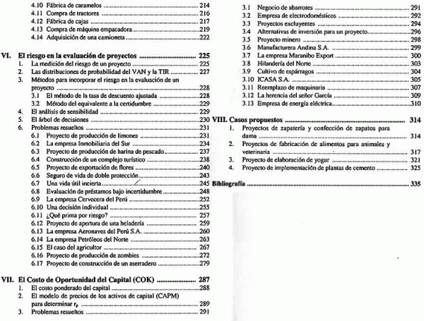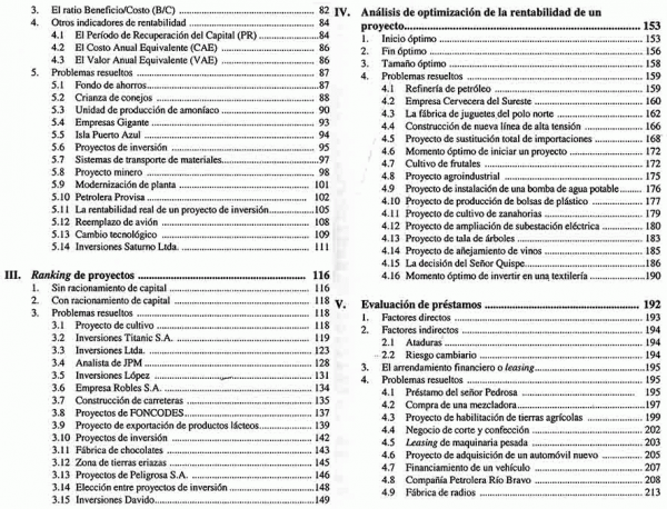 Ofrece diversos ejercicios resueltos de los tópicos que componen, principalmente, un curso de evaluación privada de proyectos, es decir, aquellos referidos a la evaluación de proyectos y fuentes de financiamiento bajo situaciones de certidumbre y riesgo: la elaboración de flujos de caja, el análisis de indicadores de rentabilidad bajo diferentes tipos de decisiones de inversión, la determinación del costo de oportunidad del capital, entre otros. Cabe mencionar que en esta tercera edición se incluyen básicamente una serie de ejercicios nuevos sobre dichos tópicos. Es más es un documento de consulta y referencia y una herramienta interesante para el estudio aplicado del curso.