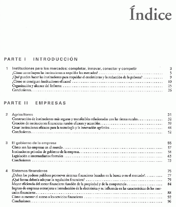 El informe es un análisis introspectivo sobre cómo apoyan las instituciones a los mercados, al crecimiento y a la reducción de la pobreza, definiendo el trabajo institucional como un canal de información sobre las condiciones del mercado, los productos y los participantes; como un medio para hacer cumplir los derechos de propiedad y los contratos, y como una herramienta para aumentar la competencia en los mercados.