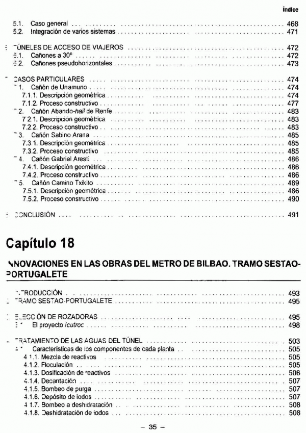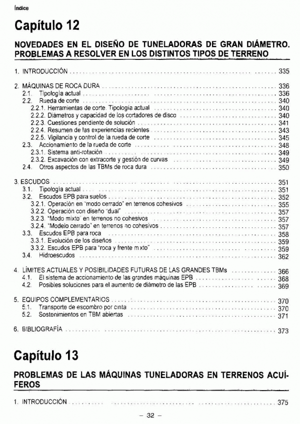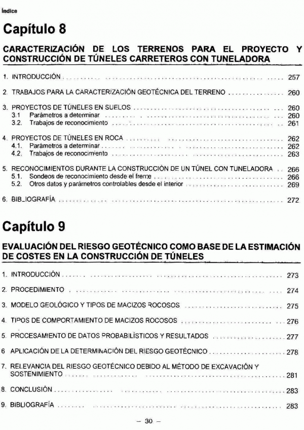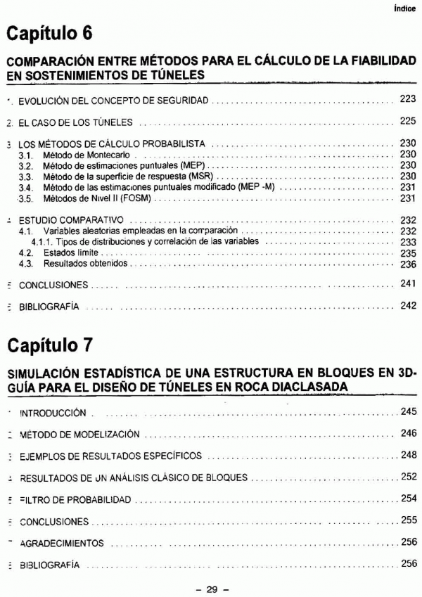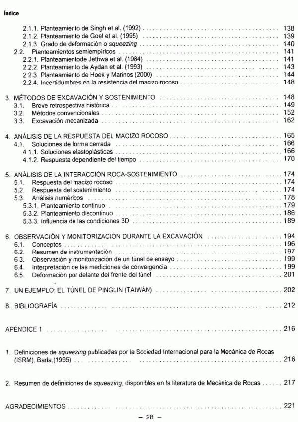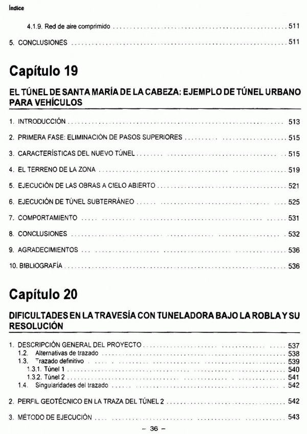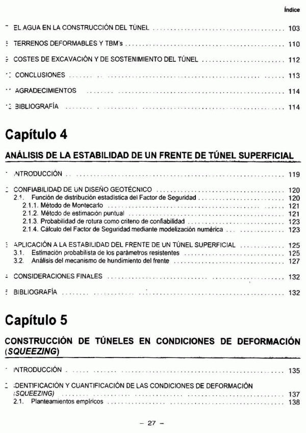 Nuevas tendencias en la caracterización del macizo rocoso y en el diseño y construcción de túneles.- La clasificación como herramienta en la ingeniería de rocas.- Grandes túneles en roca débil.- Análisis de la estabilidad de un frente de túnel superficial.- Construcción de túneles en condiciones de deformación (squeezing).- Comparación entre métodos para el cálculo de la fiabilidad en sostenimiento de túneles.- Simulación estadística de una estructura en bloques en 3D – Guía para el diseño de túneles en roca diaclasada.- Caracterización de los terrenos para el proyecto y construcción de túneles carreteros con tuneladora.- Evaluación del riesgo geotécnico como base de la estimación de costes en la construcción de túneles.- Refuerzo del terreno para túneles en condiciones geológicas difíciles.- El rendimiento de excavación con rozaduras – influencias geológicas y geotécnicas.- Novedades en el diseño de tuneladoras de gran diámetro. Problemas a resolver en distintos tipos de terrenos.- Problemas de las máquinas tuneladoras en terrenos acuíferos.- Diseño de voladuras en túneles y galerías.- Tratamiento de arenas sueltas mediante inyecciones de microcemento con microsol en los túneles de Sinesio Delgado (Madrid).- El túnel de Abdalajis ejecutado con TBM en la línea de alta velocidad Córdoba-Málaga.- Túneles reventilación y acceso de viajeros en las estaciones del Metro de Bilbao.- Innovaciones en las obras del Metro de Bilbao: tramo de Sestao-Portugalete.- El túnel de Santa María de la Cabeza: ejemplo de túnel urbano para vehículos.- Dificultades en la travesía con tuneladora bajo la Robla y su resolución.