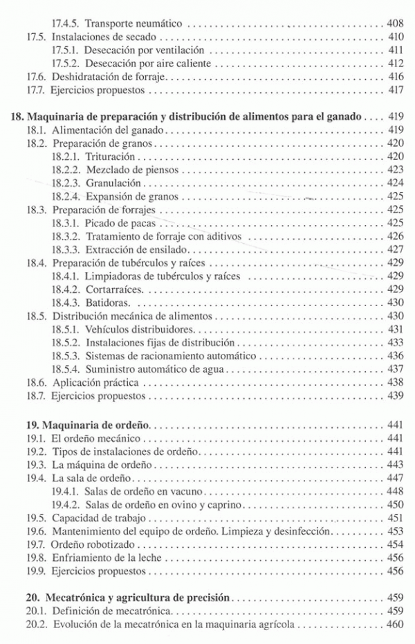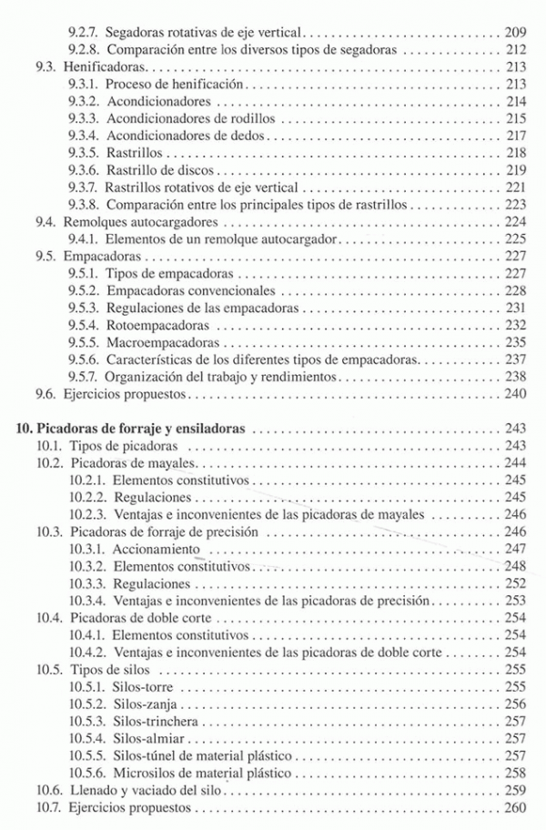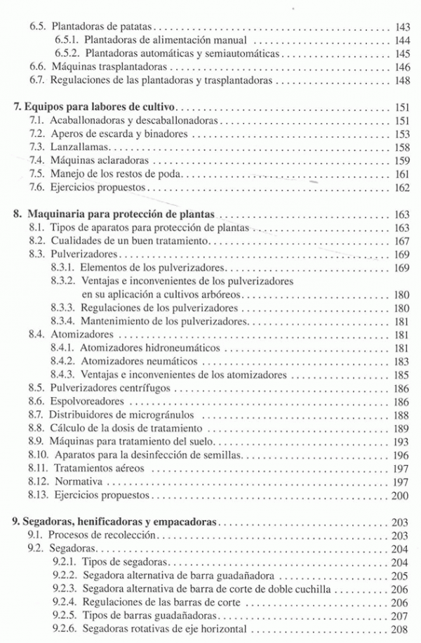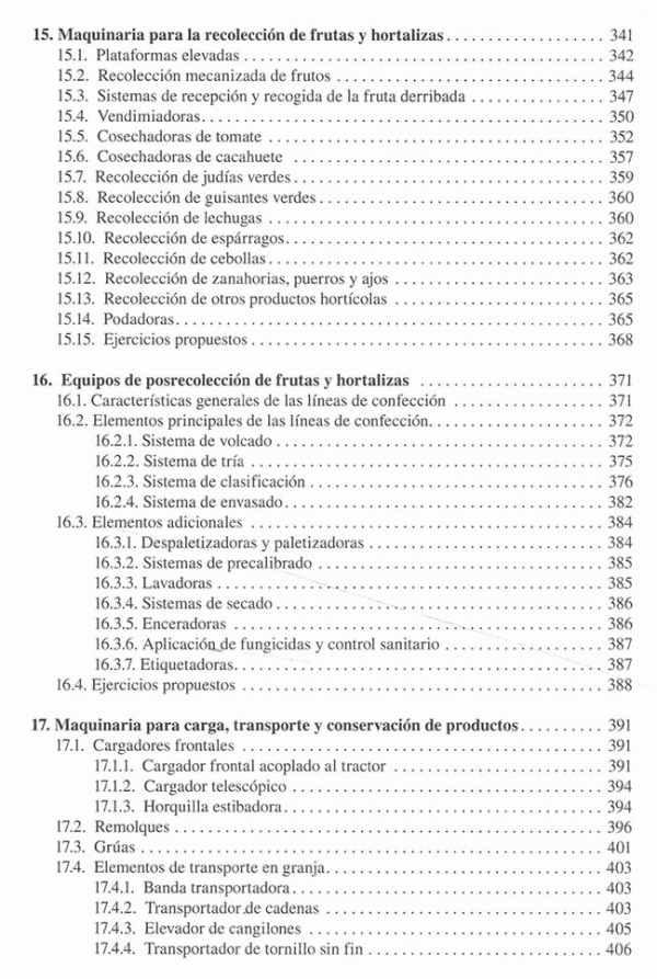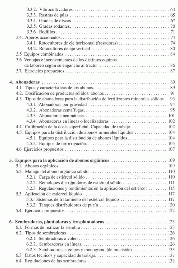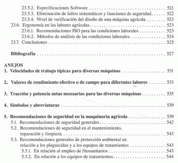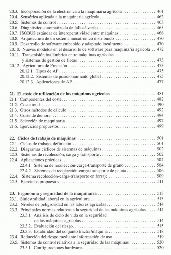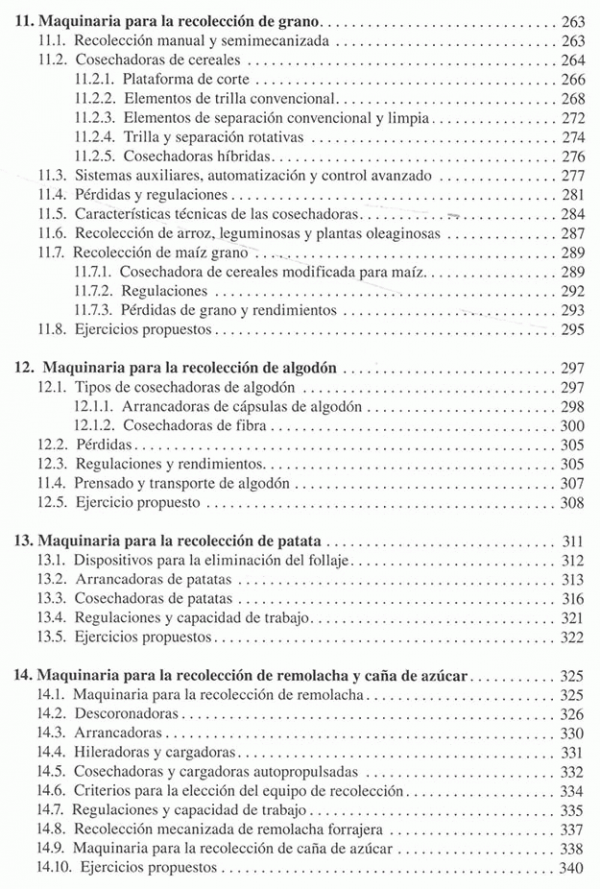 Introducción al estudio de las maquinas agrícolas, laboreo del terreno, labranza del subsuelo, vertical y asimétrica, labranza superficial, equipos no accionados, accionados y combinados, abonadoras, equipos para la aplicación de abonos orgánicos, sembradores, plantadoras y trasplantadoras, equipos para labores de cultivo, maquinaria para protección de plantas, segadoras, henificadoras y empacadoras, picadoras de forraje y ensiladoras, maquina para la recoleccion de grano, maquina para la recolección de algodón, maquina para recolección de patata, maquinaria para la recolección de remolacha y caña de azúcar, maquinaria para la recolección de frutas y hortalizas, equipos de posrecoleccion de frutas y hortalizas, maquinaria para carga, transporte y conservación de productos, maquinaria de preparación y distribución de alimentos para el ganado, maquinaria de ordeño, mecatronica y agricultura de precisión, el coste de utilización de las maquinas agrícolas, ciclos de trabajo de maquinas, ergonomia y seguridad de la maquinaria.