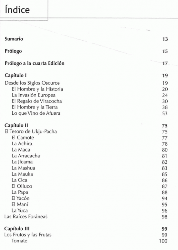 Contiene un poco de historia del consumo de los cultivos andinos y los productos venidos de Europa como la maca, la oca, el tomate, lo citricos, el platano, los condimentos, las carnes, bebidas, etc.