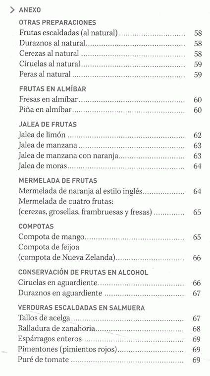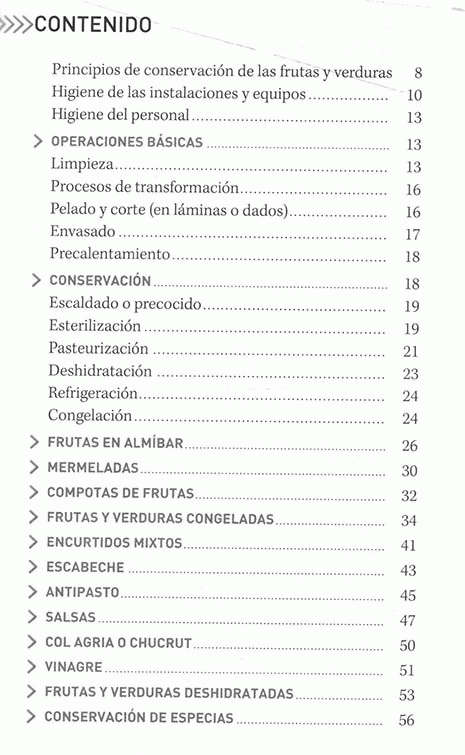 Principios de conservación de frutas y verduras, operaciones básicas, conservación, frutas en almíbar, mermelada, compotas de frutas, frutas y verduras congeladas, encurtidos mixtos, escabeche, antipasto, salsas, col agria o chucrut, vinagre, frutas y verduras deshidratadas, conservación de especias.